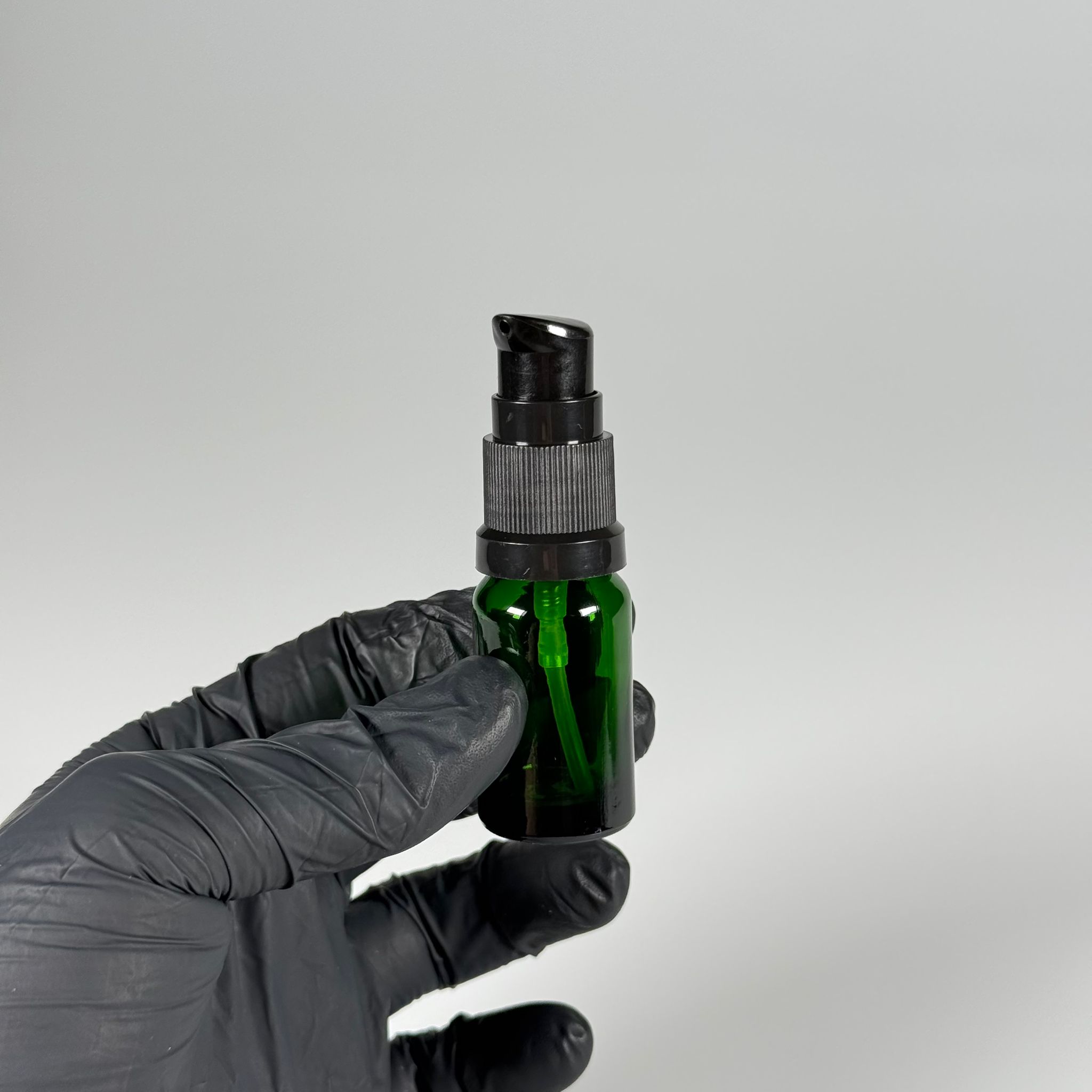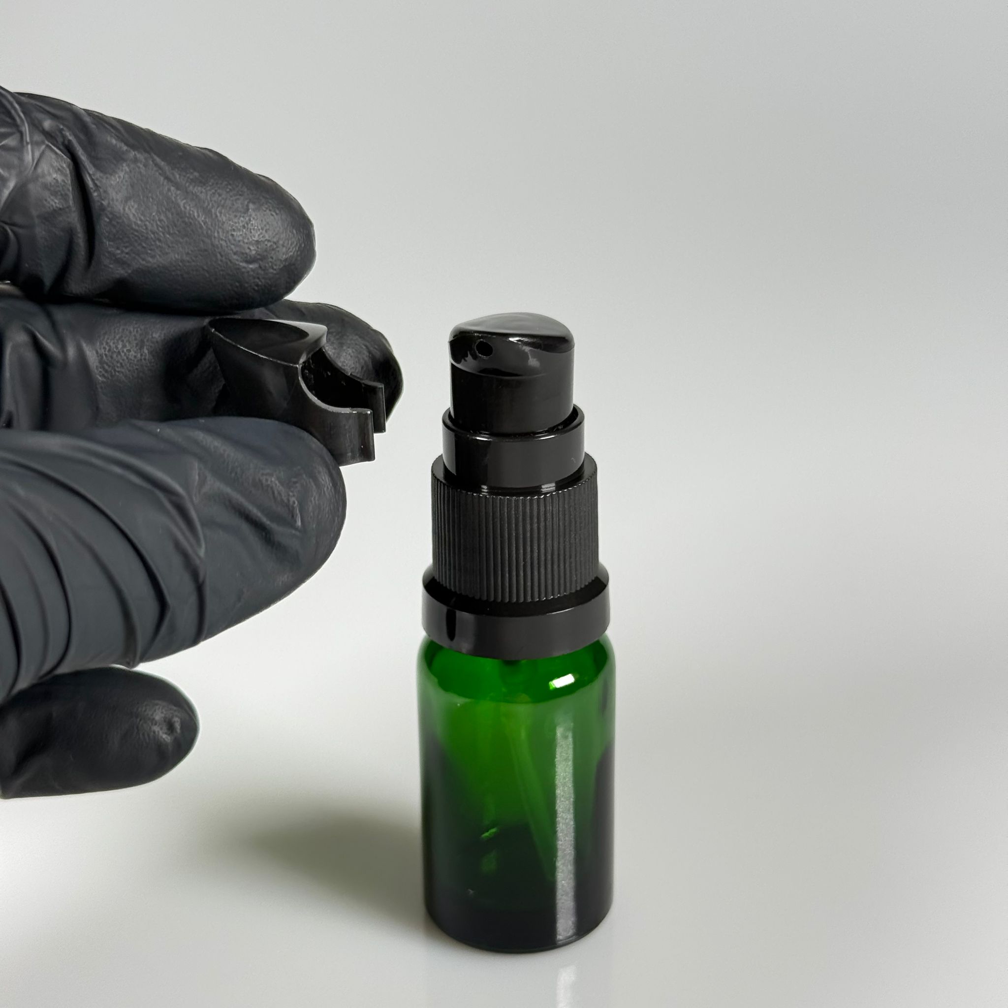 10 CC YEŞİL CAM ŞİŞE - SIZDIRMAZ ETEKLİ SİYAH LOSYON POMPALI TAKIM - 10 ML LOSYON ŞİŞESİ - YAĞ, KREM GİBİ YOĞUN KIVAMLI SIVILAR İÇİN CAM AMBALAJ