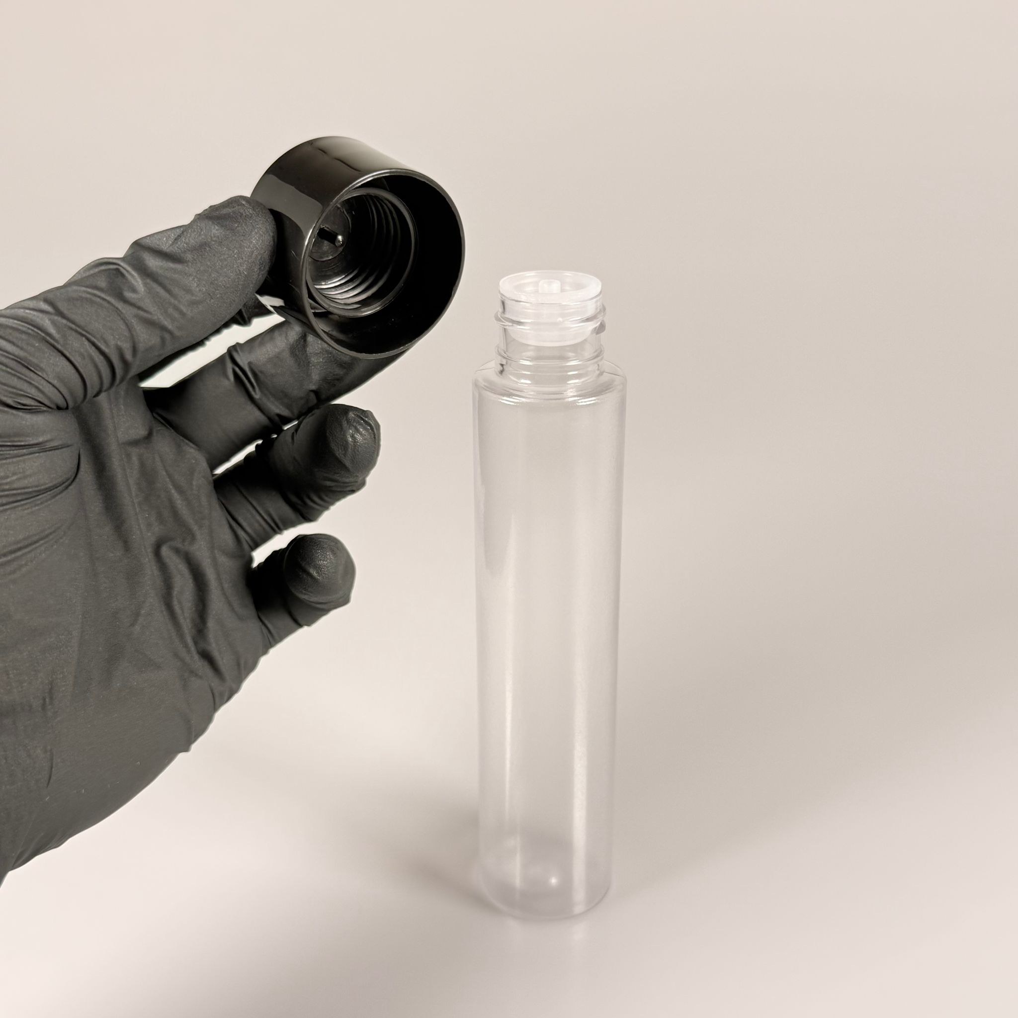 100 CC UZUN SİLİNDİR BUĞULU PET ŞİŞE (24 GR) - SİYAH DERİN ETEKLİ KAPAKLI KOLONYA TIPALI - 100 ML BİBERİYE SUYU, LAVANTA YAĞI, SAÇ SERUM, TONİK VB İÇİN PLASTİK KOZMETİK AMBALAJLARI