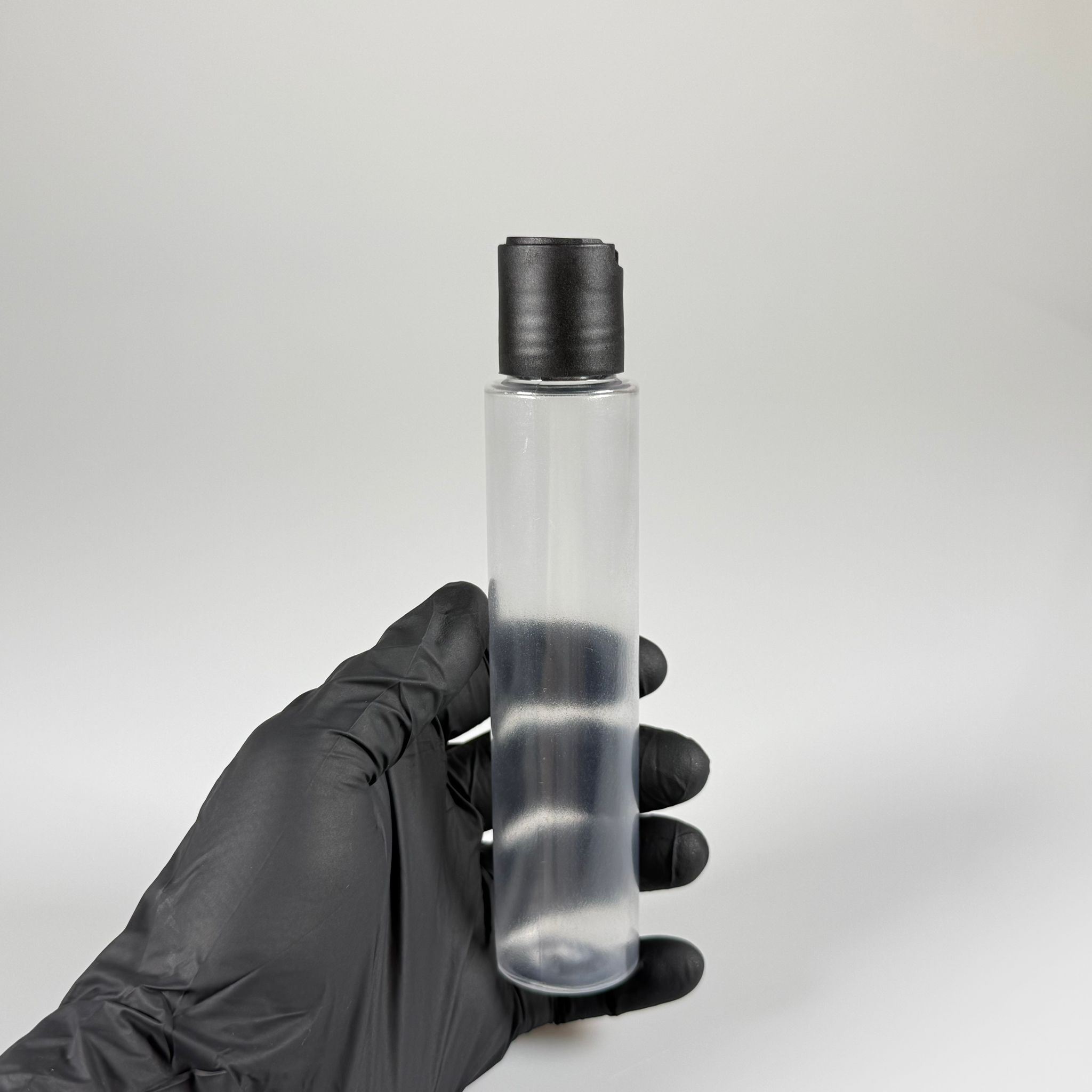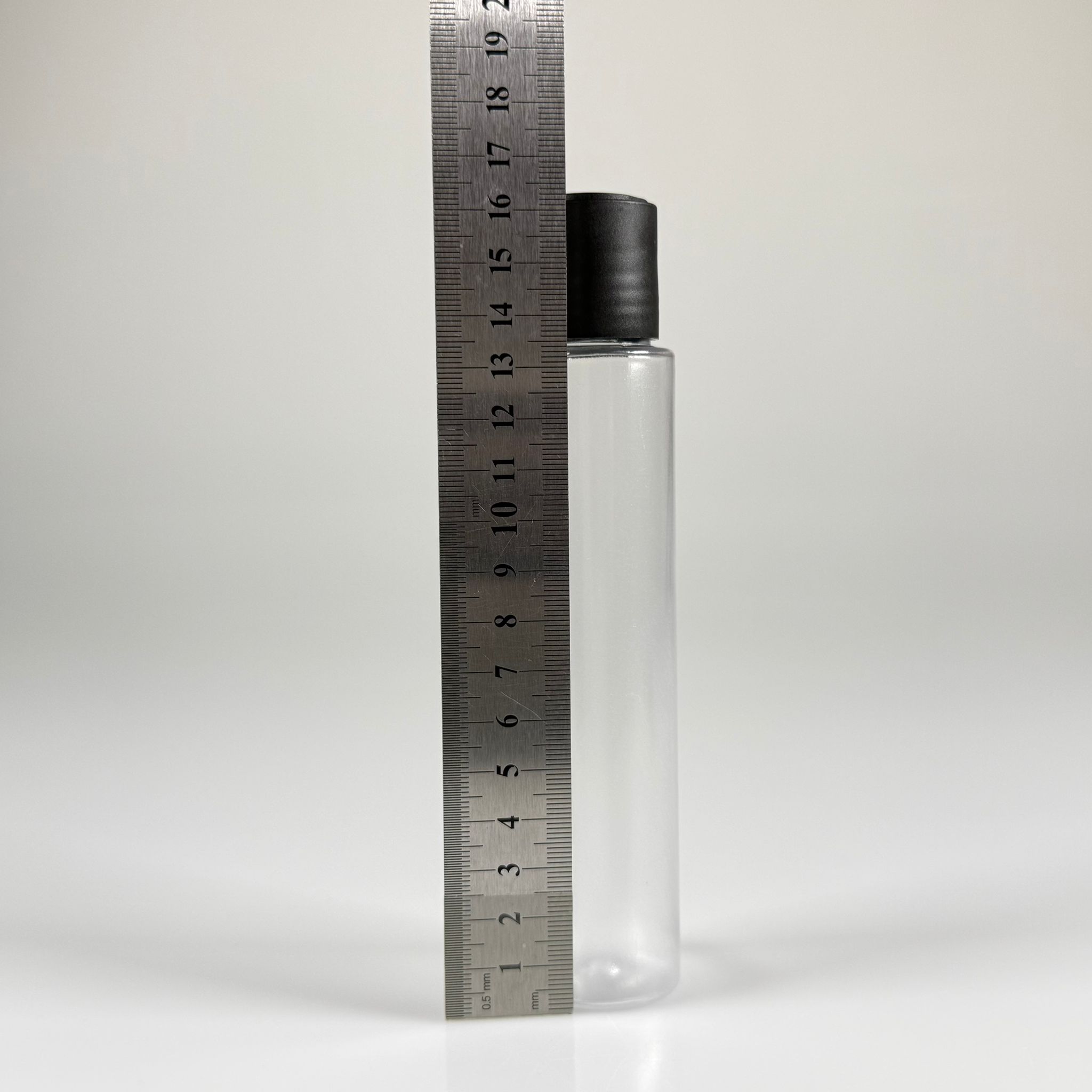 100 CC UZUN SİLİNDİR BUĞULU PET ŞİŞE (24 GR) - SİYAH DİSKTOP AKITICI ŞAMPUAN KAPAKLI - 100 ML BİBERİYE SUYU, LAVANTA YAĞI, SAÇ SERUM, TONİK VB İÇİN PLASTİK KOZMETİK AMBALAJLARI