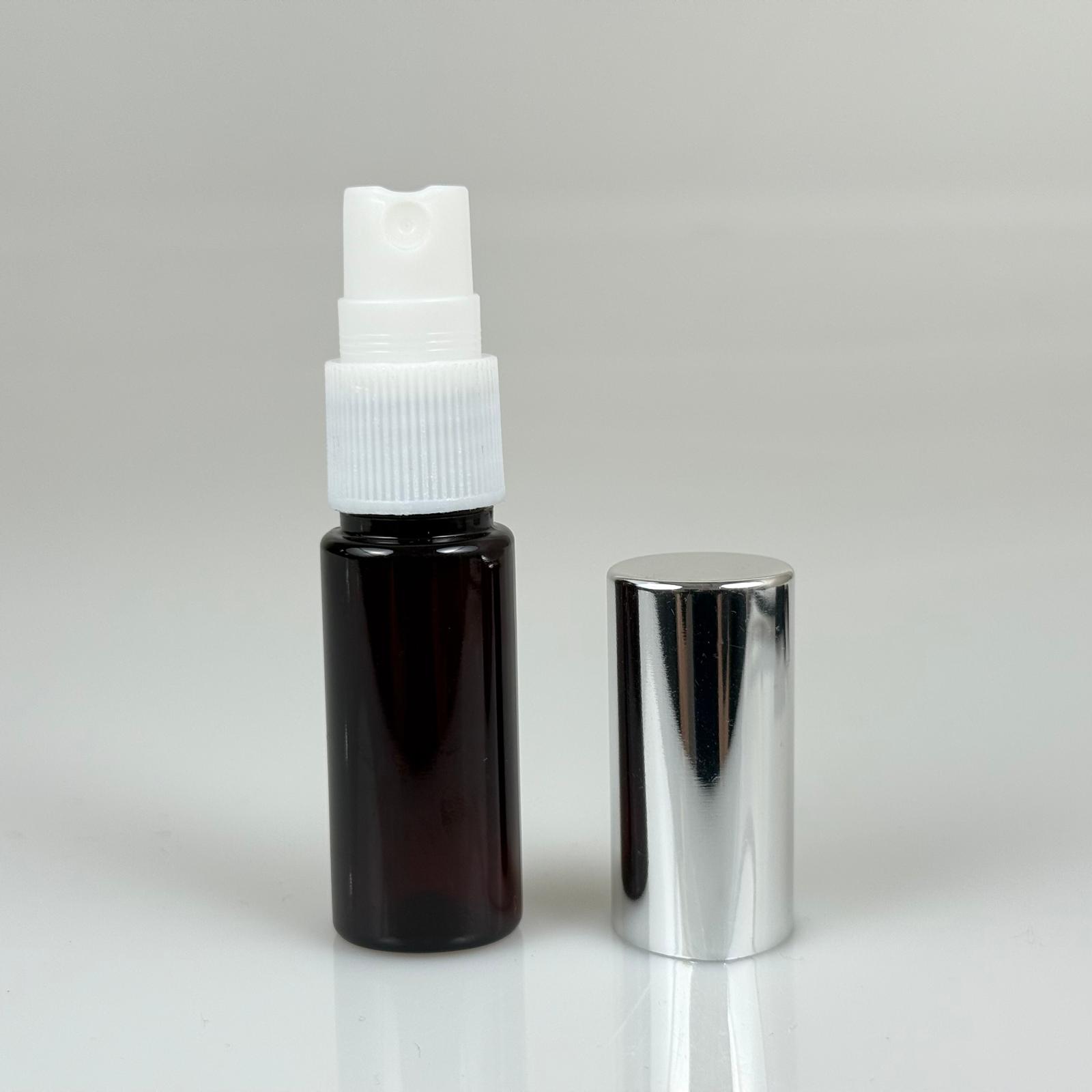 15 ML PET KOLONYA, PARFÜM VB ŞİŞELERİ - METAL ALÜMİNYUM GÜMÜŞ KAPAK + VİDALI SPREY + 15 CC AMBER ŞİŞE SET TAKIM