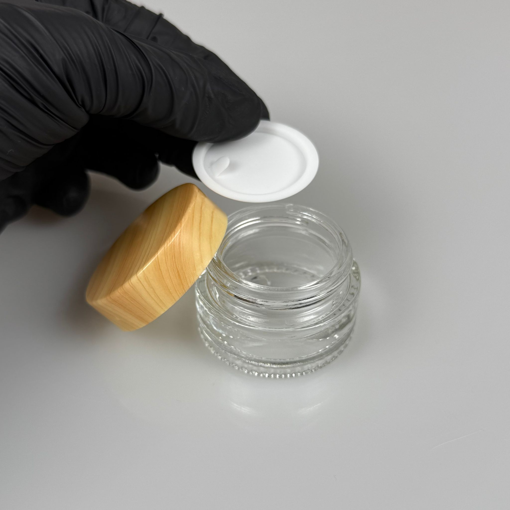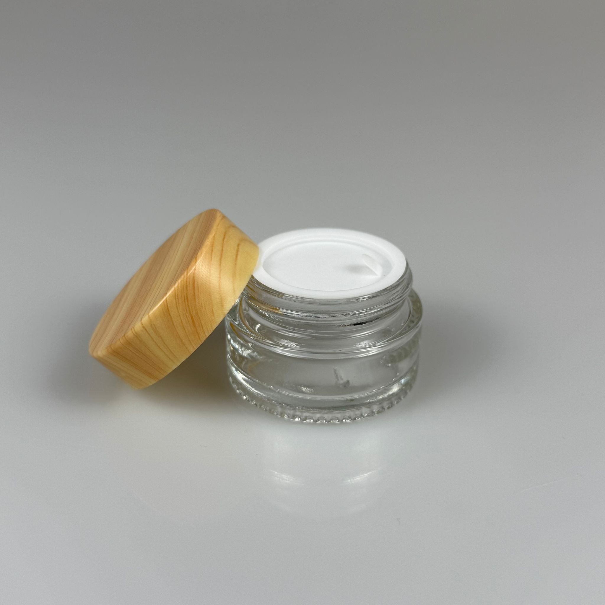 20 CC CAM ŞEFFAF KREM KAVANOZU - AHŞAP DESENLİ PLASTİK KAPAKLI İÇ CONTALI - 20 ML ŞEFFAF CAM KAVANOZ - KOZMETİK KAVANOZ