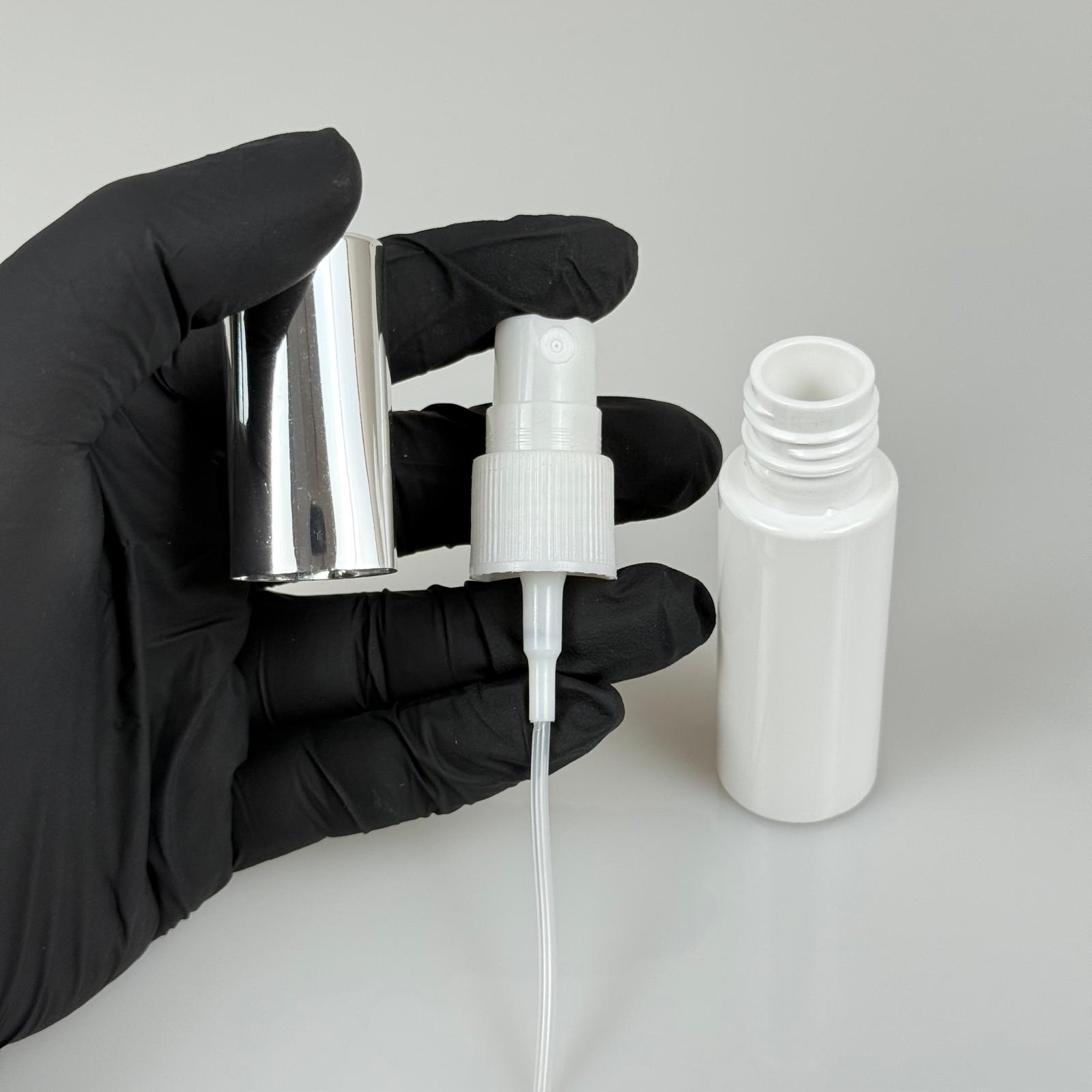 20 ML PET KOLONYA, PARFÜM VB ŞİŞELERİ - METAL ALÜMİNYUM GÜMÜŞ KAPAK + VİDALI SPREY + 20 CC BEYAZ UZUN MODEL ŞİŞE SET TAKIM