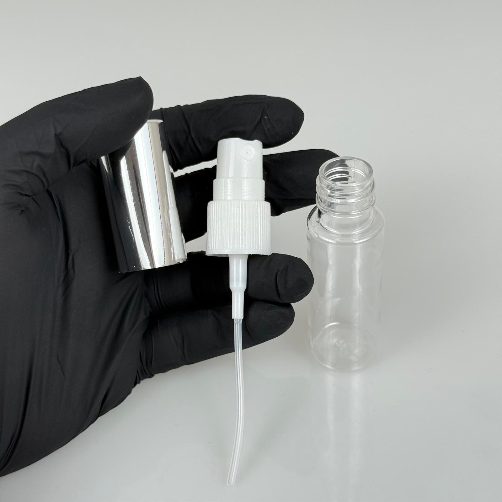 20 ML PET KOLONYA, PARFÜM VB ŞİŞELERİ - METAL ALÜMİNYUM GÜMÜŞ KAPAK + VİDALI SPREY + 20 CC UZUN MODEL ŞİŞE SET TAKIM
