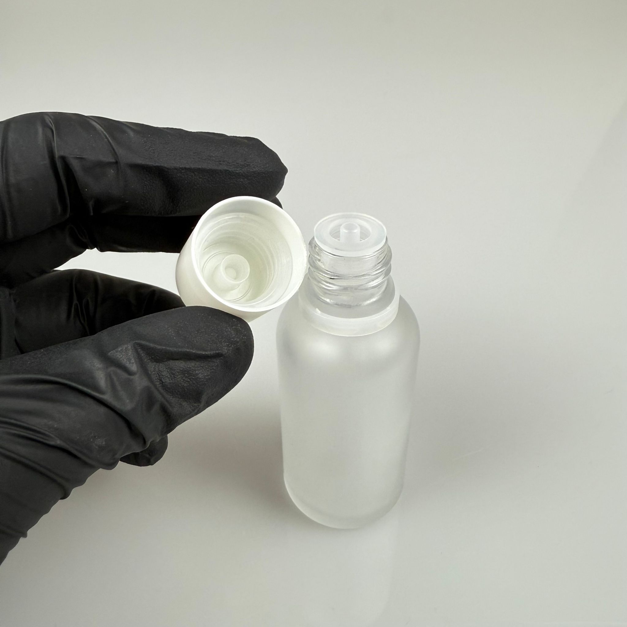 30 CC BUZLU CAM ŞİŞE + İÇTEN DAMLALIKLI ÇOCUK KİLİTLİ BEYAZ KAPAK - BUZLU 30 ML KİLİT KAPAKLI DAMLATMALI ŞİŞE