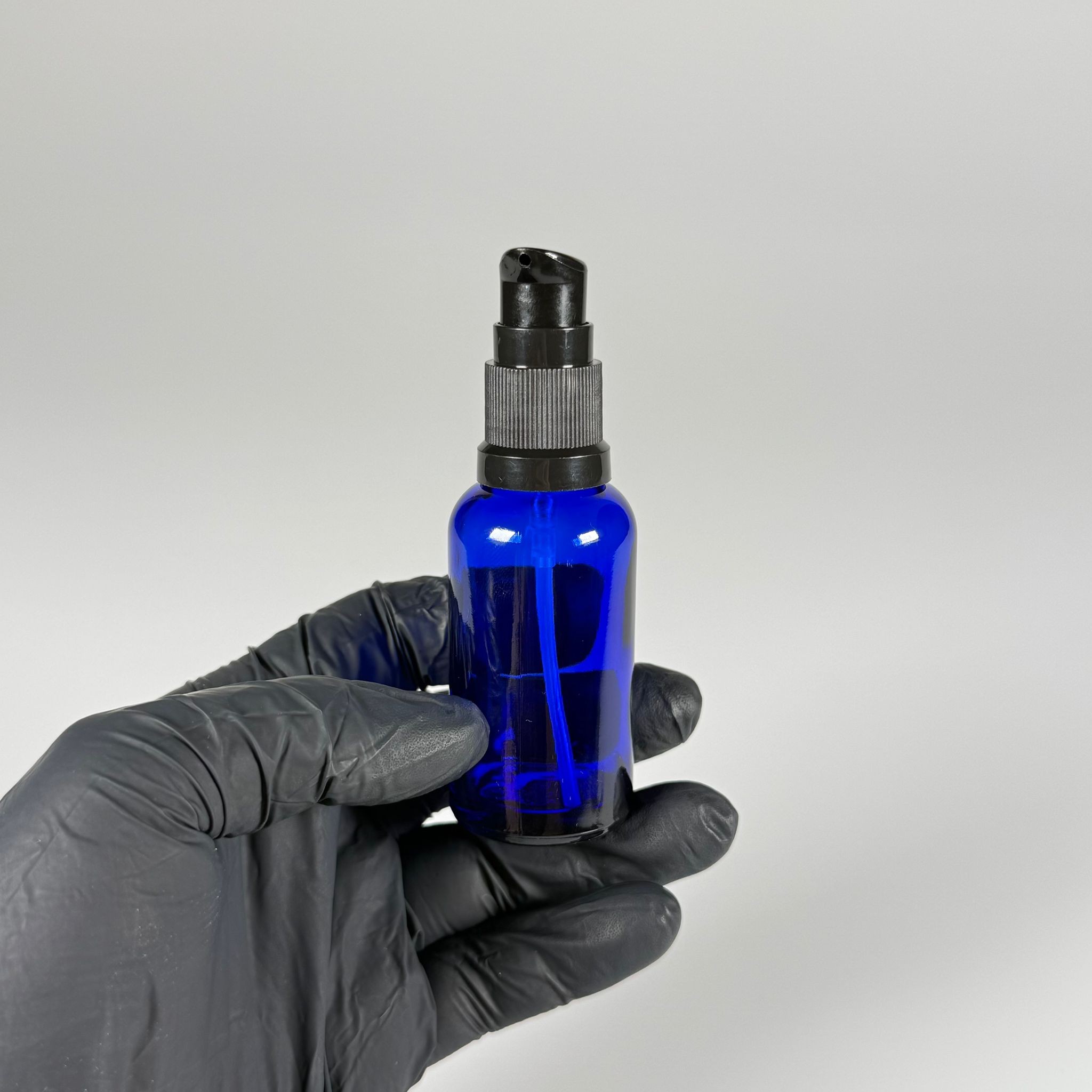 30 CC MAVİ CAM ŞİŞE - SIZDIRMAZ ETEKLİ SİYAH LOSYON POMPALI TAKIM - 30 ML LOSYON ŞİŞESİ - YAĞ, KREM GİBİ YOĞUN KIVAMLI SIVILAR İÇİN CAM AMBALAJ