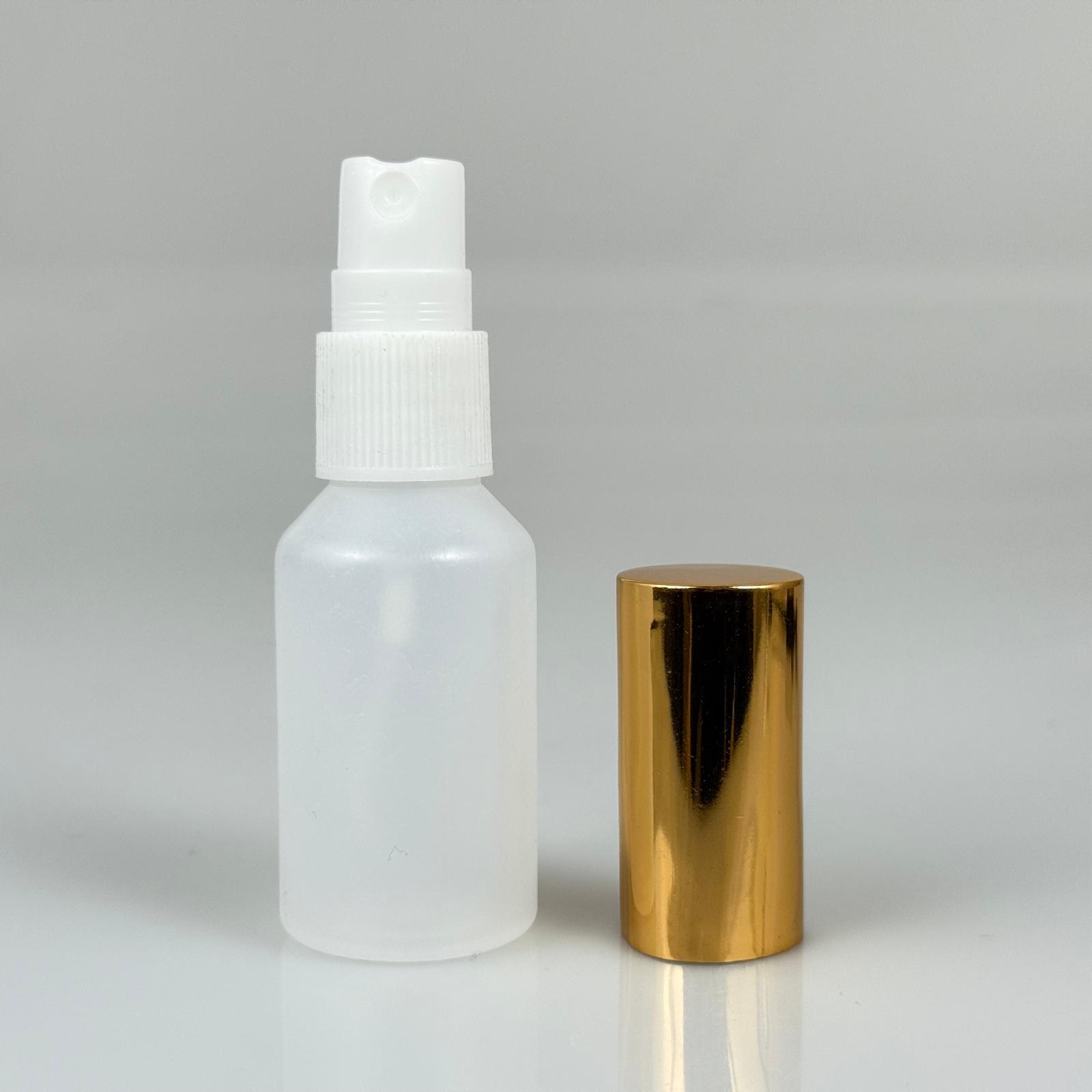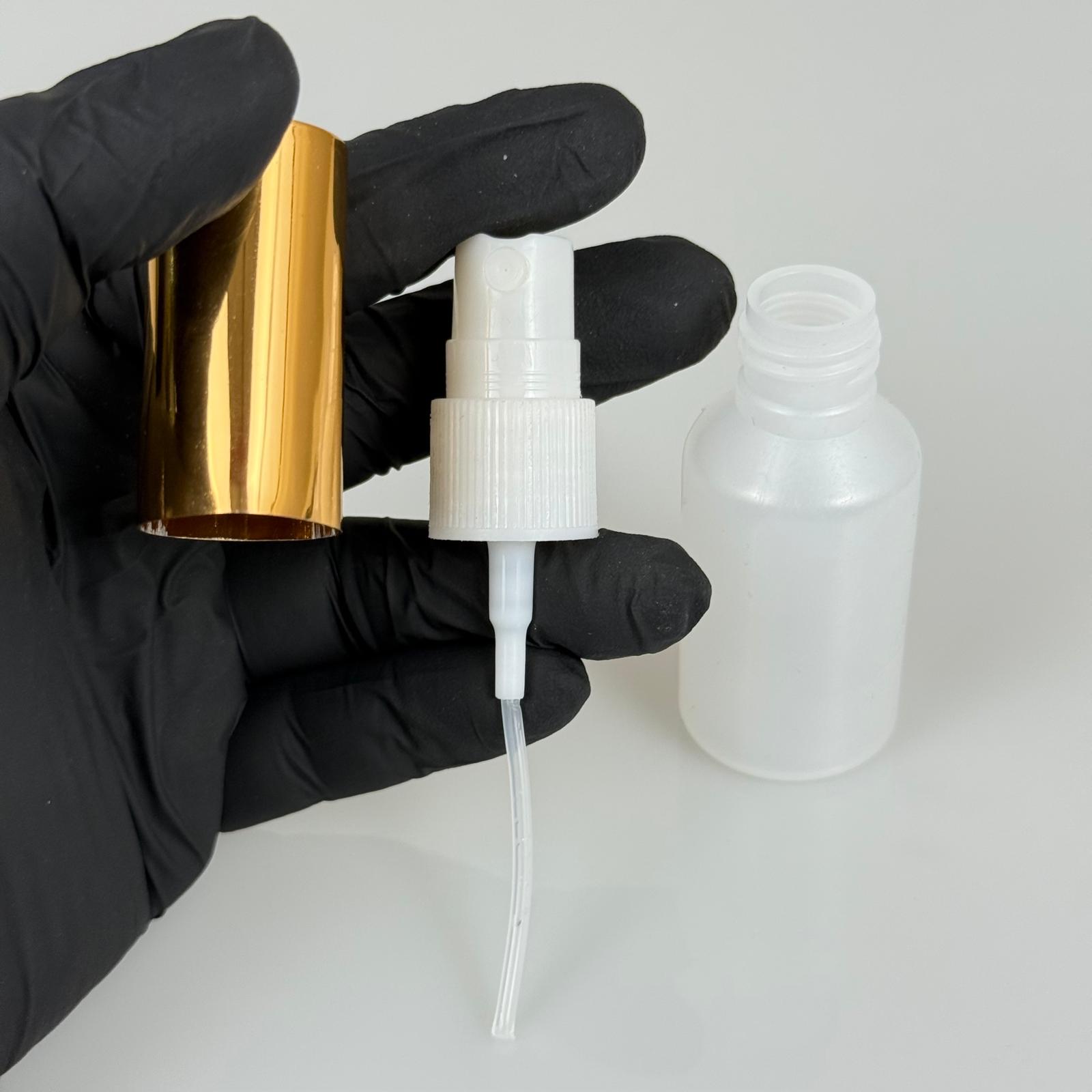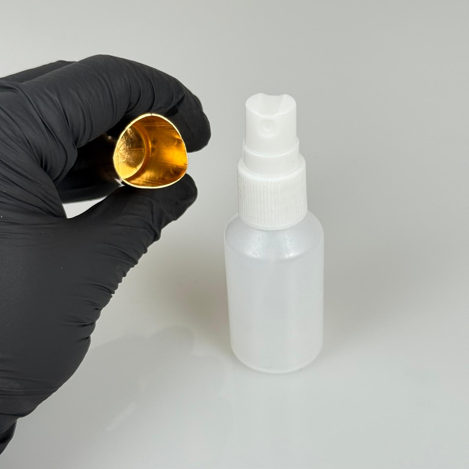 30 ML POLİETİLEN KOLONYA, PARFÜM VB ŞİŞELERİ - METAL ALÜMİNYUM GOLD KAPAK + VİDALI SPREY + 30 CC NATÜREL ŞİŞE SET TAKIM