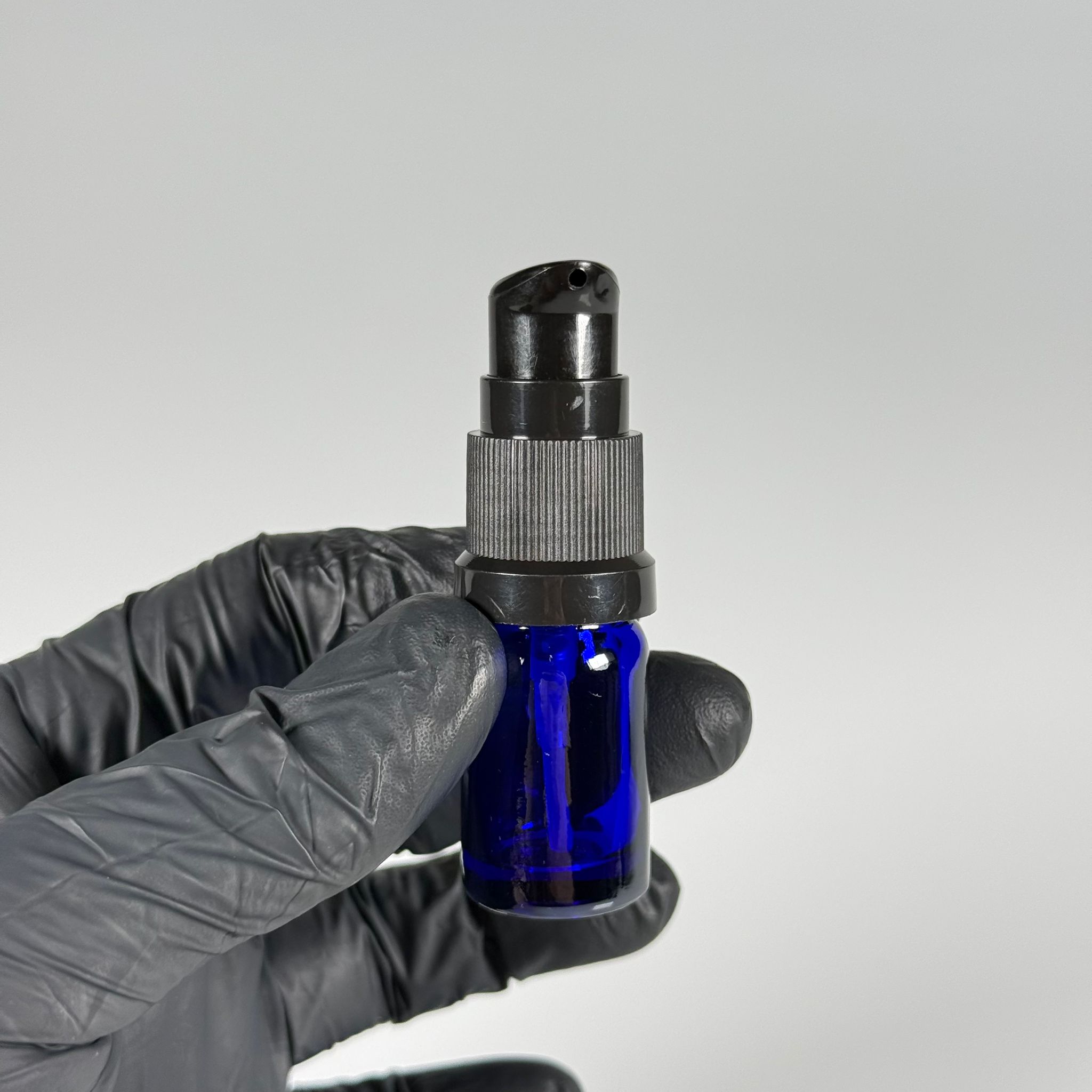 5 CC MAVİ CAM ŞİŞE - SIZDIRMAZ ETEKLİ SİYAH LOSYON POMPALI TAKIM - 5 ML LOSYON ŞİŞESİ - YAĞ, KREM GİBİ YOĞUN KIVAMLI SIVILAR İÇİN CAM AMBALAJ