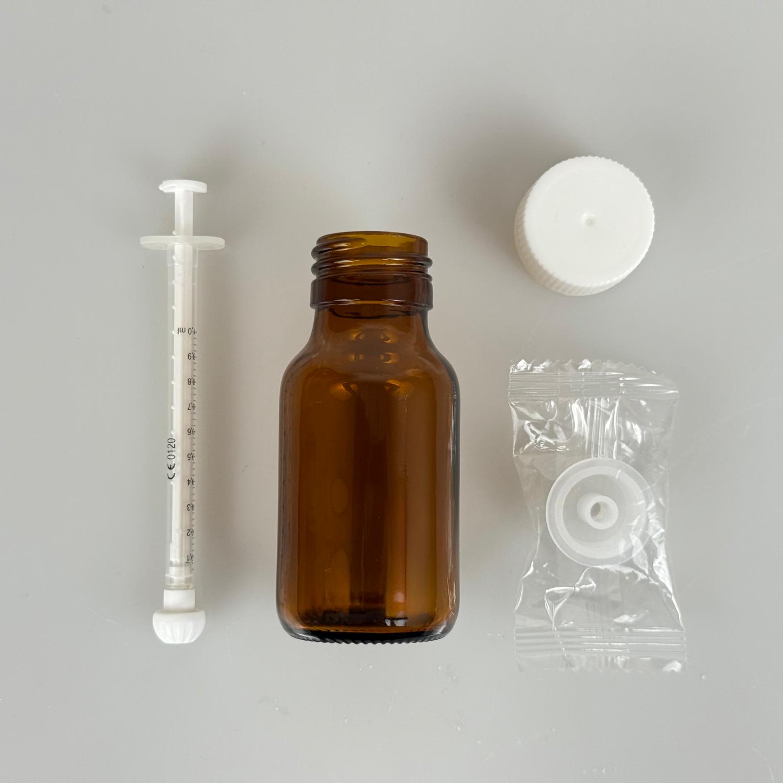 50 ML CAM ECZA ŞİŞESİ + 1 ML DOZAJ PİPETİ + DOZAJ TIPASI + CONTALI PLASTİK KAPAK TAKIM