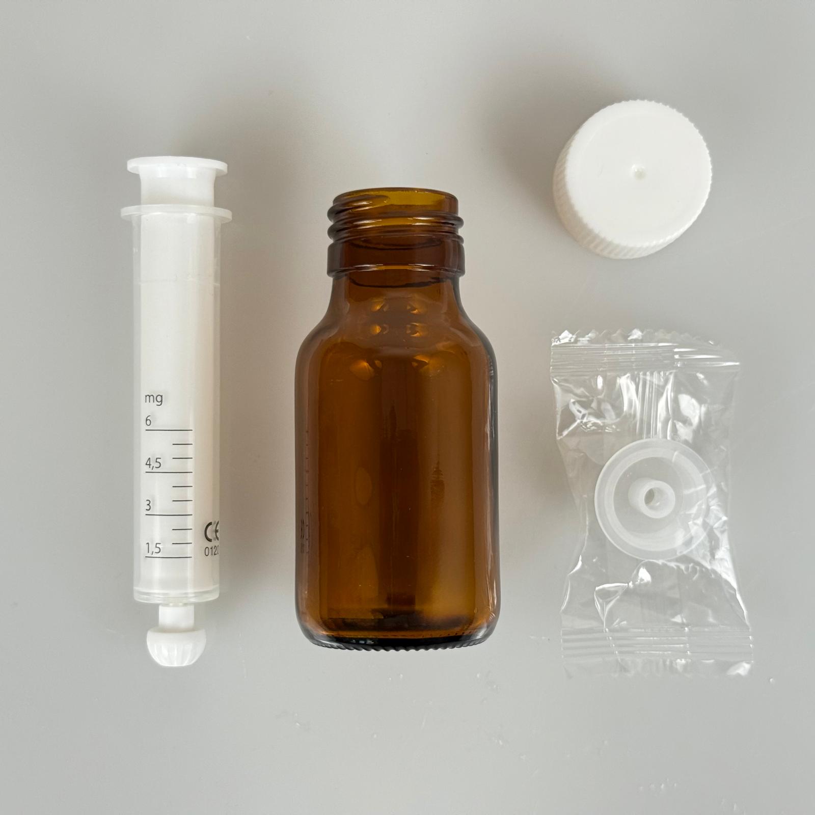 50 ML CAM ECZA ŞİŞESİ + 6 ML DOZAJ PİPETİ + DOZAJ TIPASI + CONTALI PLASTİK KAPAK TAKIM