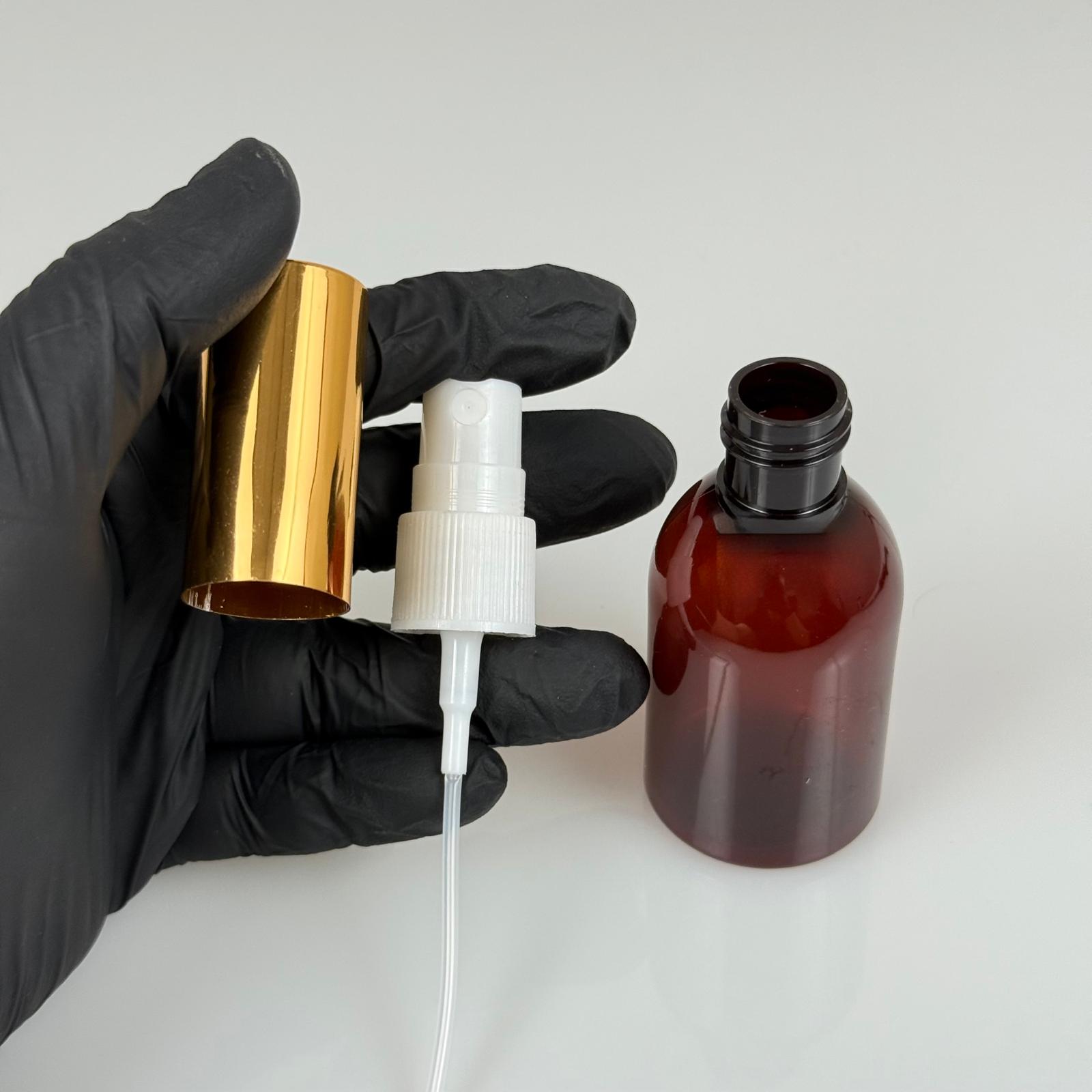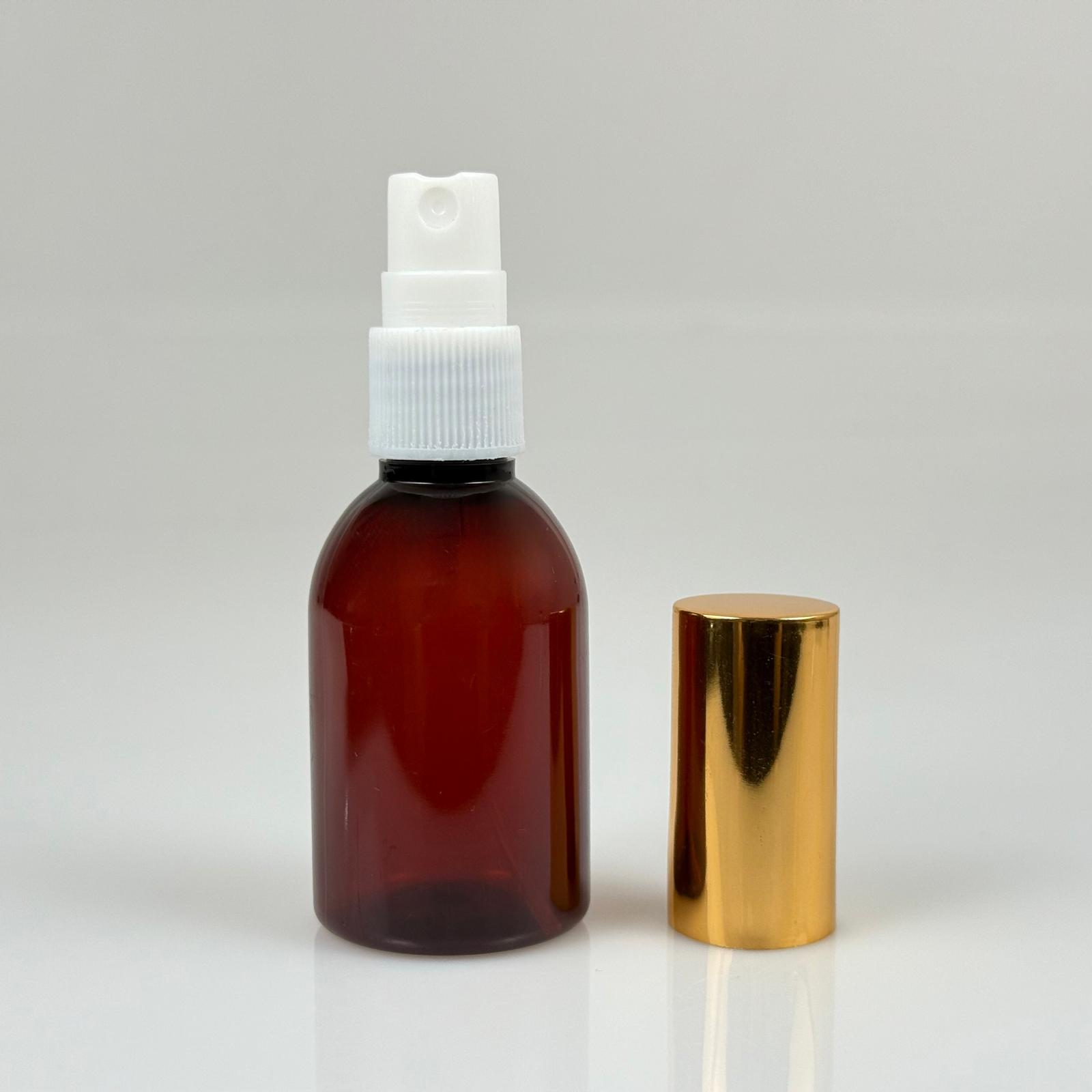 50 ML PET KOLONYA, PARFÜM VB ŞİŞELERİ - METAL ALÜMİNYUM GOLD KAPAK + VİDALI SPREY + 50 CC AMBER ŞİŞE SET TAKIM