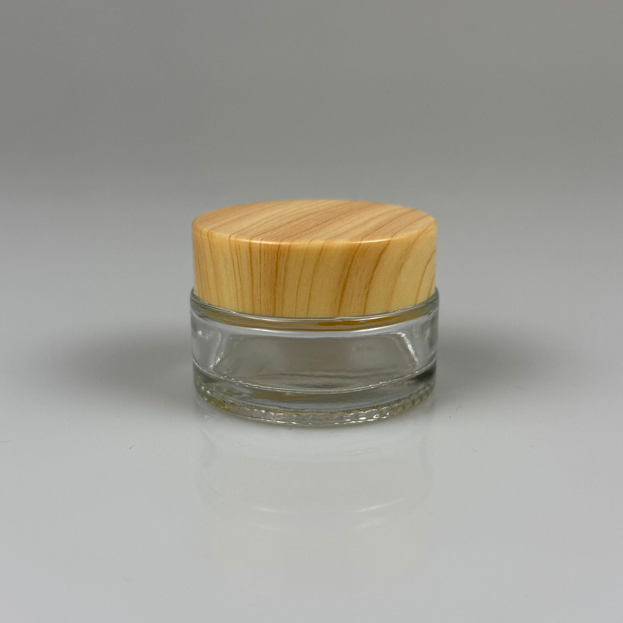 20 CC CAM ŞEFFAF KREM KAVANOZU - AHŞAP DESENLİ PLASTİK KAPAKLI İÇ CONTALI - 20 ML ŞEFFAF CAM KAVANOZ - KOZMETİK KAVANOZ