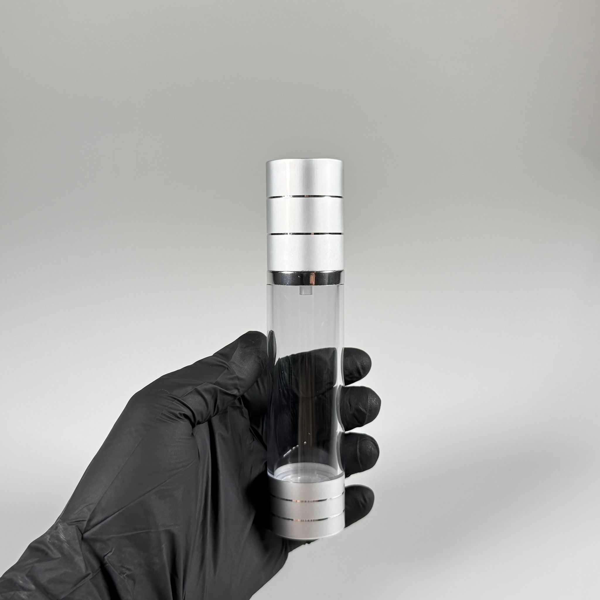 BOŞ KREM VE LOSYON ŞİŞESİ 50 ML BOŞ AİRLESS ŞİŞE - HAVASIZ POMPALI GÜMÜŞ ÜSTÜ YALDIZLI AİRLESS ŞİŞE