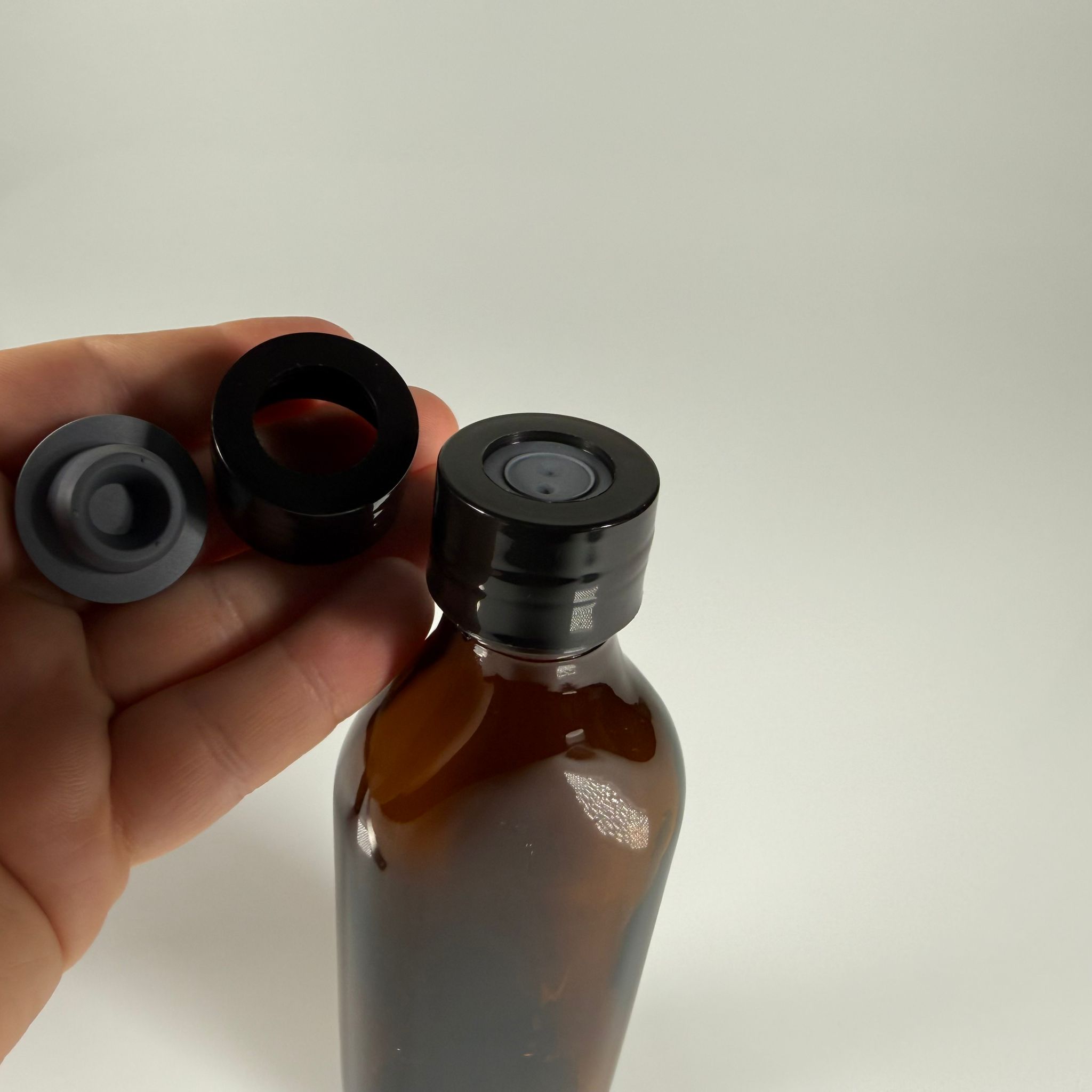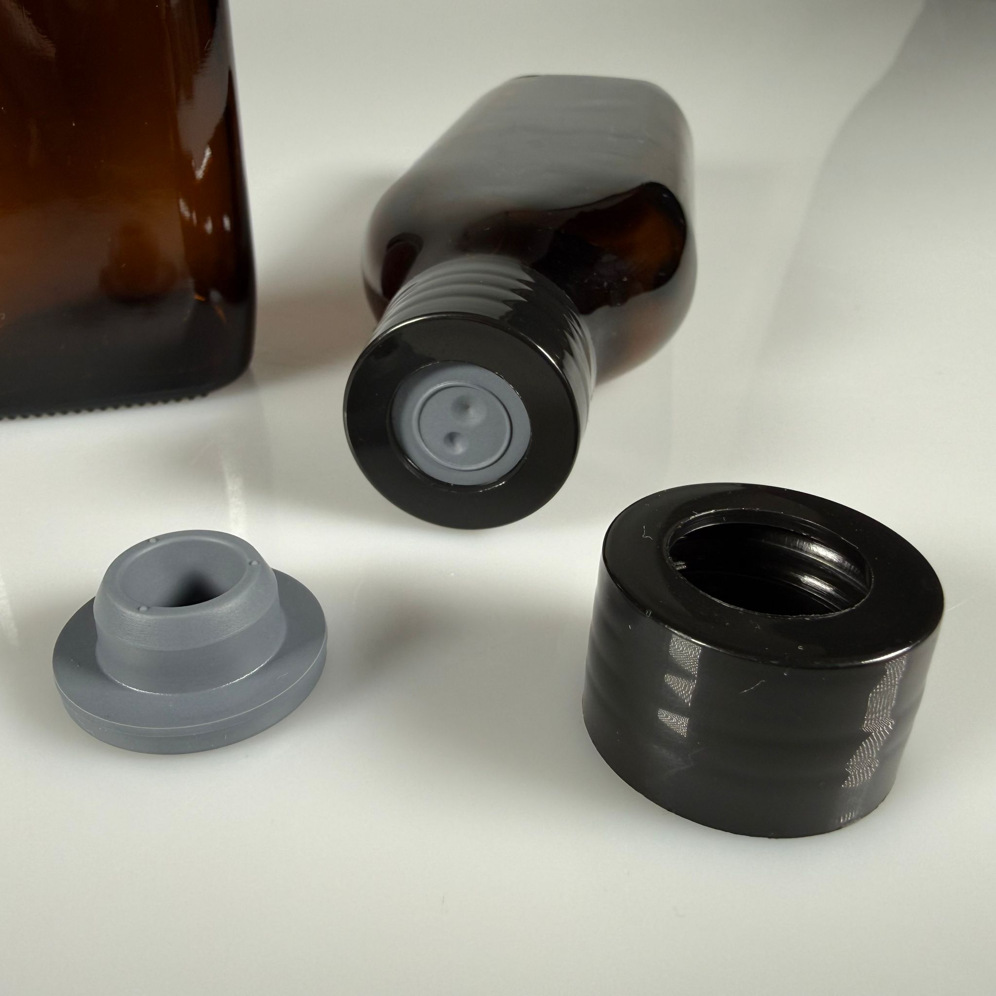 FLAKON ENJEKTÖR SERUM ŞİŞESİ - 150 ML YASSI ECZA CAM ŞİŞE + VİDALI DELİKLİ KAPAK (ELLE ÇEVİREREK KAPANIR) + KAUÇUK BUTİL TIPA TAKIM