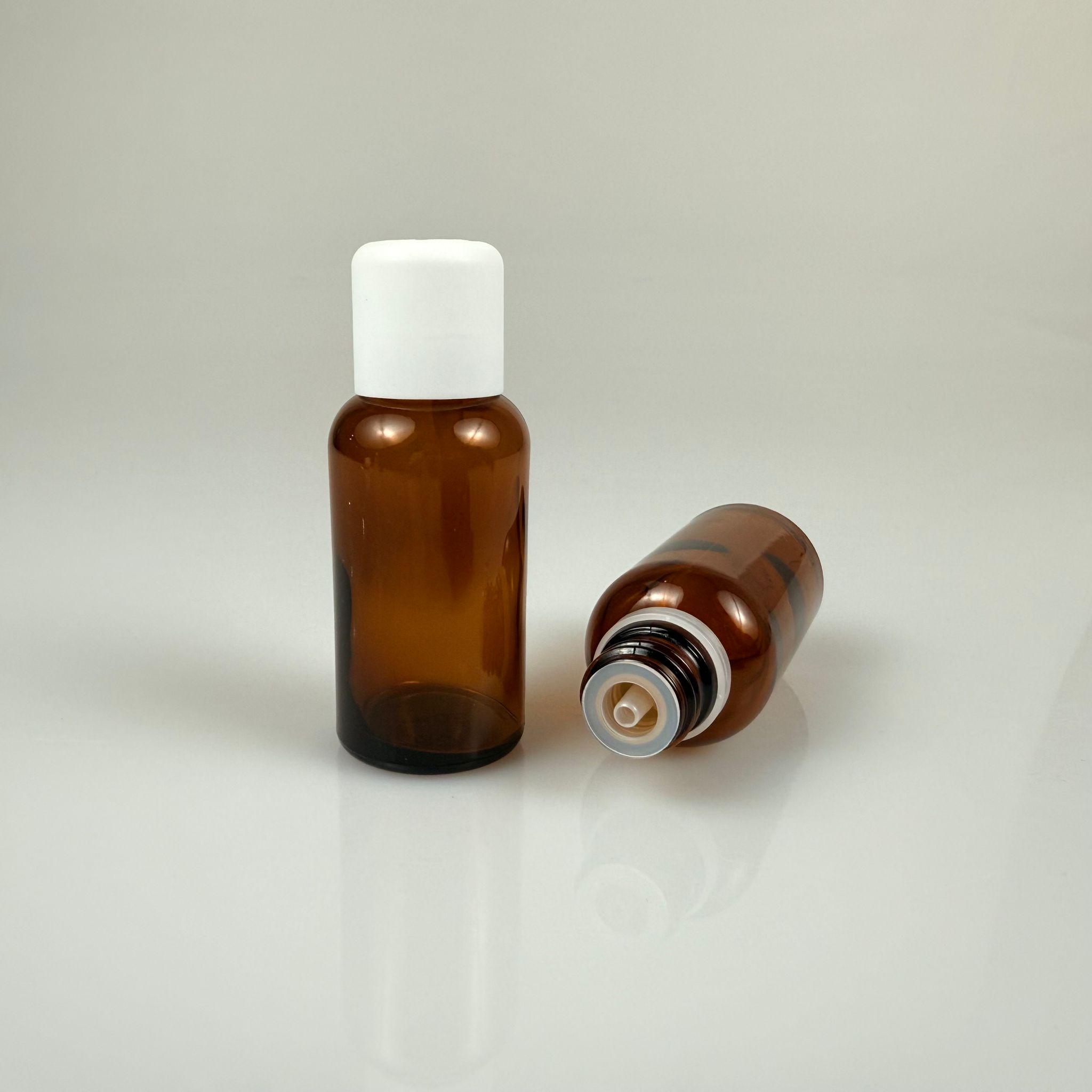 30 CC AMBER YASSI İÇTEN DAMLALIKLI (OPSİYONEL DAMLALIK) - BEYAZ KİLİTLİ KAPAKLI CAM ŞİŞE - 30 ML KOLONYA TIPALI CAM ŞİŞE