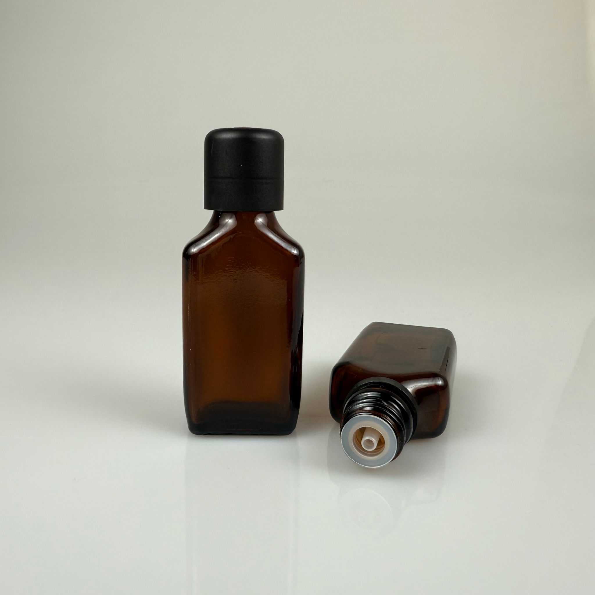30 CC AMBER YASSI CAM ŞİŞE + İÇTEN DAMLALIKLI ÇOCUK KİLİTLİ SİYAH KAPAK - KAHVERENGİ 30 ML KİLİT KAPAKLI DAMLATMALI ŞİŞE