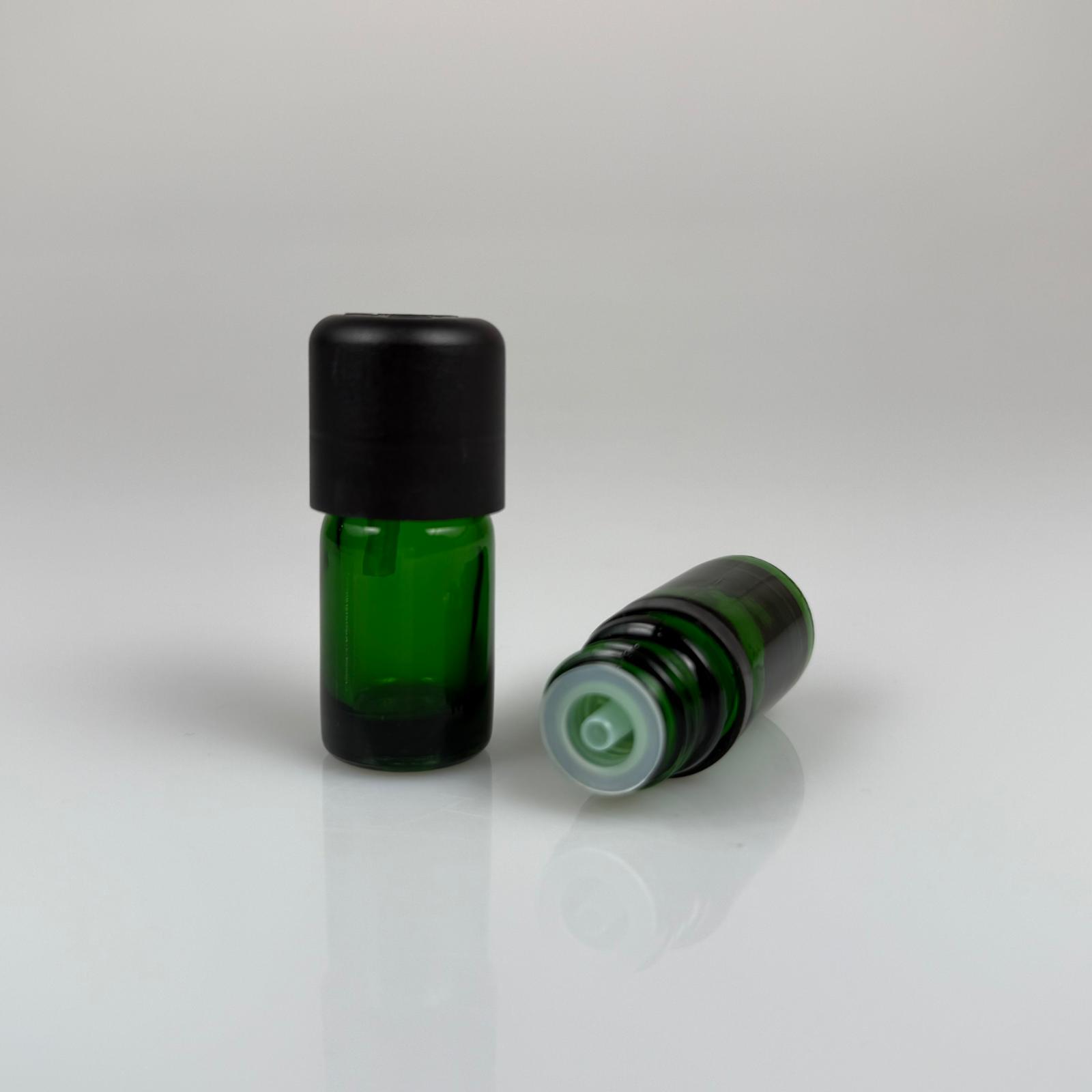 5 CC YEŞİL İÇTEN DAMLALIKLI (OPSİYONEL DAMLALIK) - SİYAH KİLİTLİ KAPAKLI CAM ŞİŞE - 5 ML KOLONYA TIPALI CAM ŞİŞE