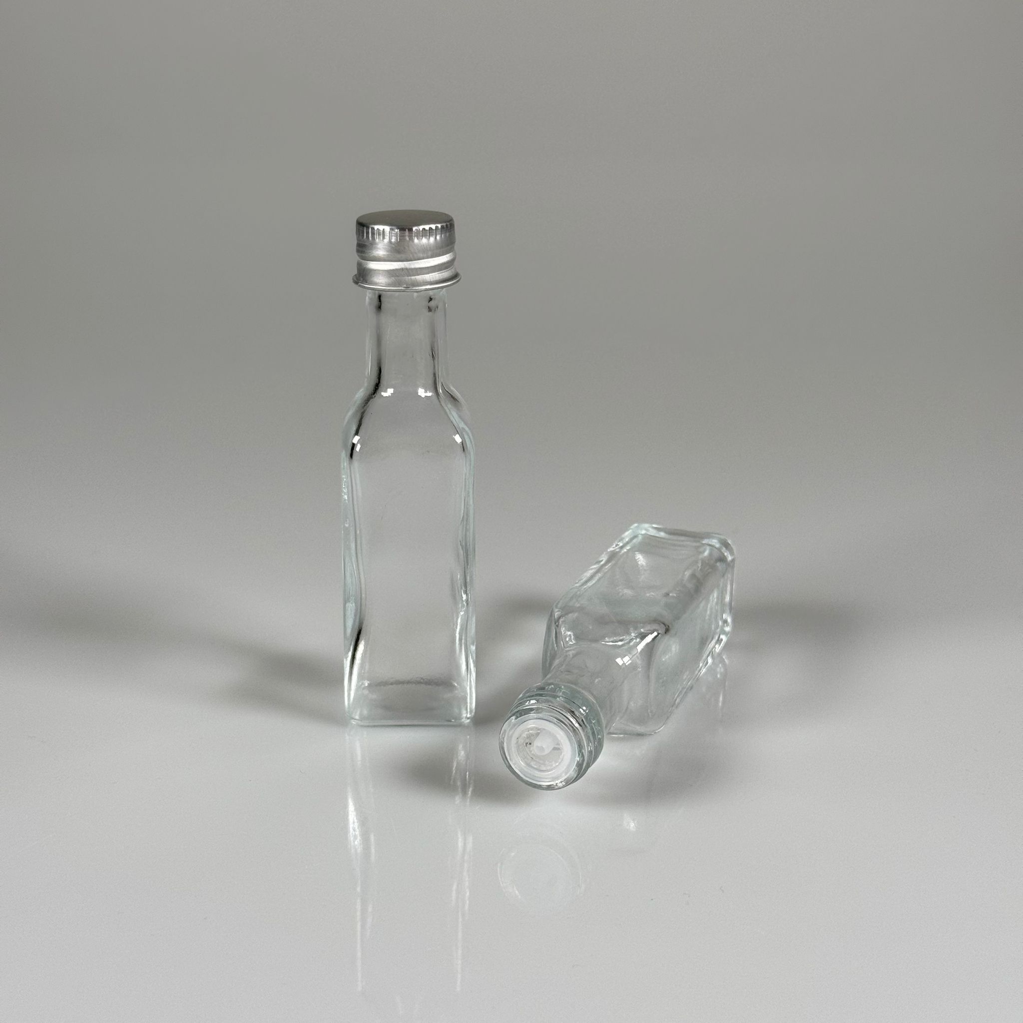 20 CC MARASKA KÖŞELİ KARE CAM ŞİŞE - CONTALI METAL ALÜMİNYUM GÜMÜŞ KAPAKLI - 20 ML KAPAKLI CAM ŞİŞE (SİLME 23 ML ALIR)