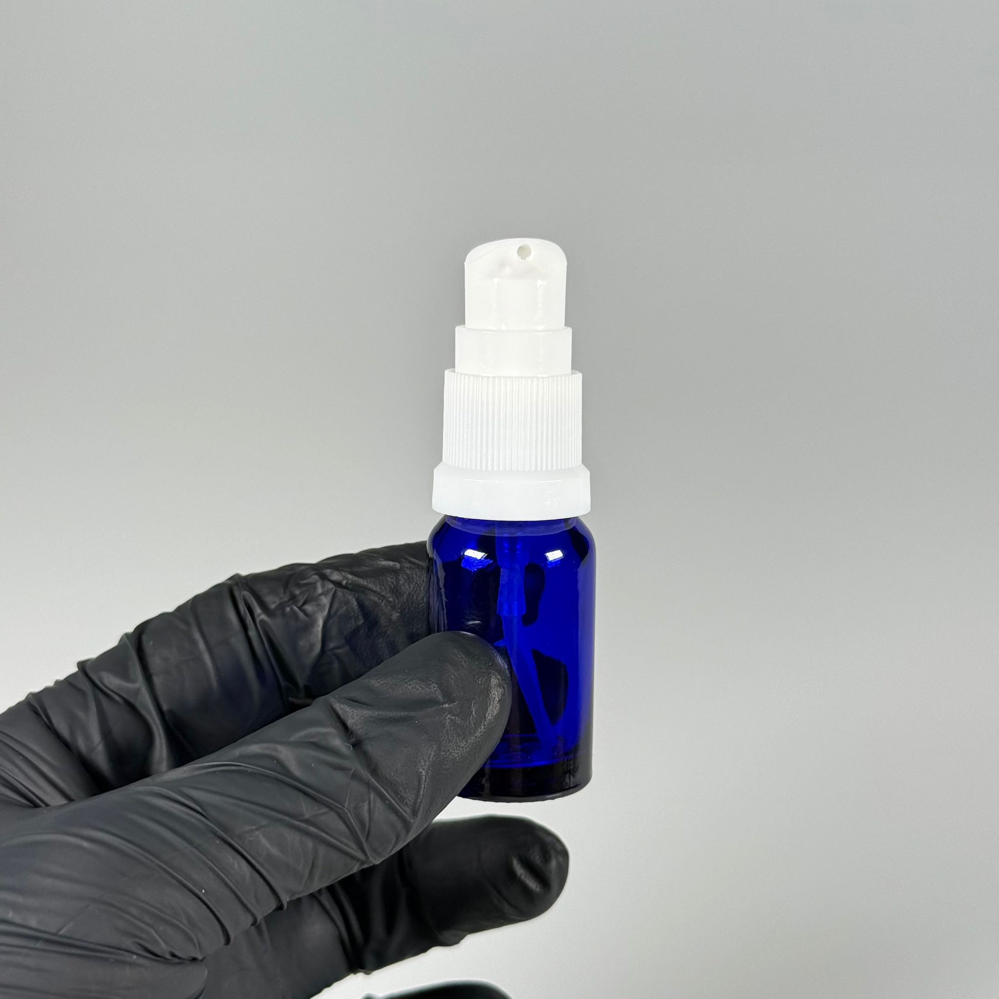 10 CC MAVİ CAM ŞİŞE - SIZDIRMAZ ETEKLİ BEYAZ LOSYON POMPALI TAKIM - 10 ML LOSYON ŞİŞESİ - YAĞ, KREM GİBİ YOĞUN KIVAMLI SIVILAR İÇİN CAM AMBALAJ