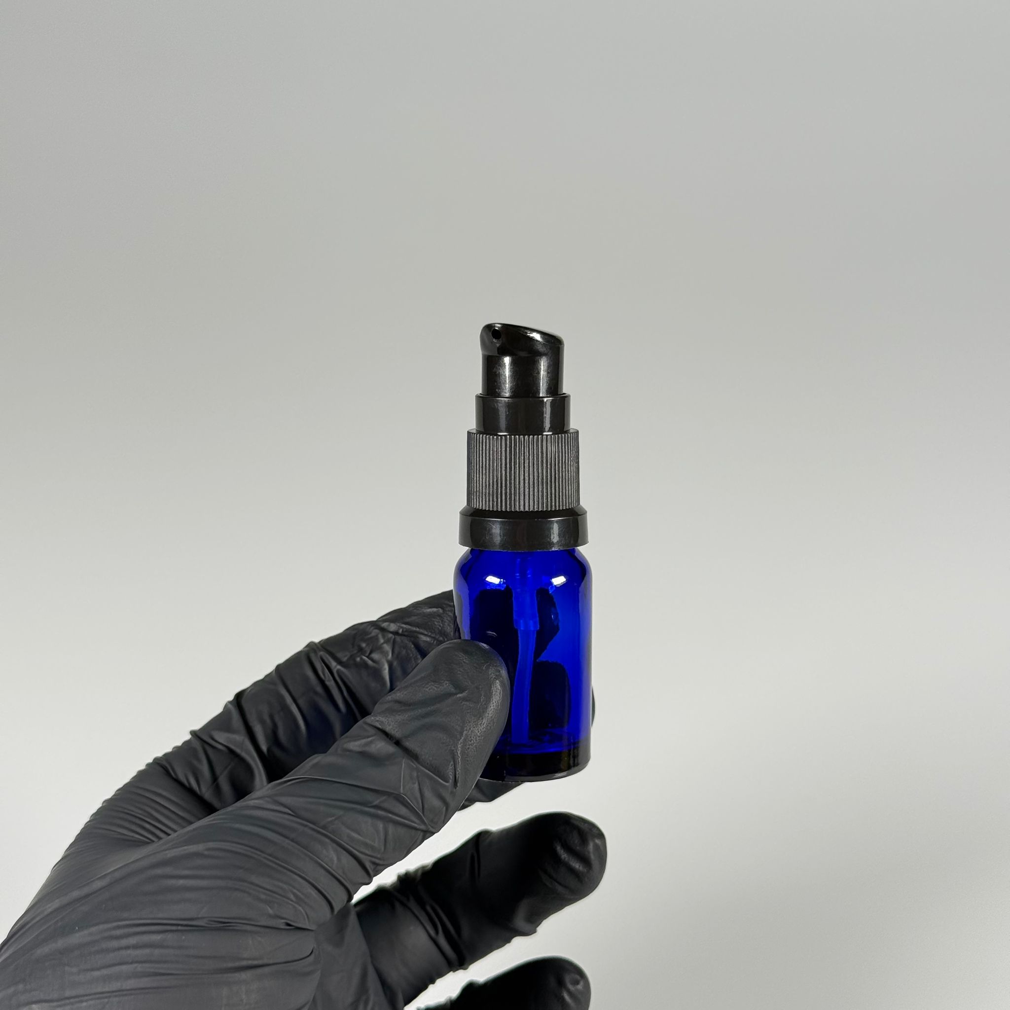 10 CC MAVİ CAM ŞİŞE - SIZDIRMAZ ETEKLİ SİYAH LOSYON POMPALI TAKIM - 10 ML LOSYON ŞİŞESİ - YAĞ, KREM GİBİ YOĞUN KIVAMLI SIVILAR İÇİN CAM AMBALAJ