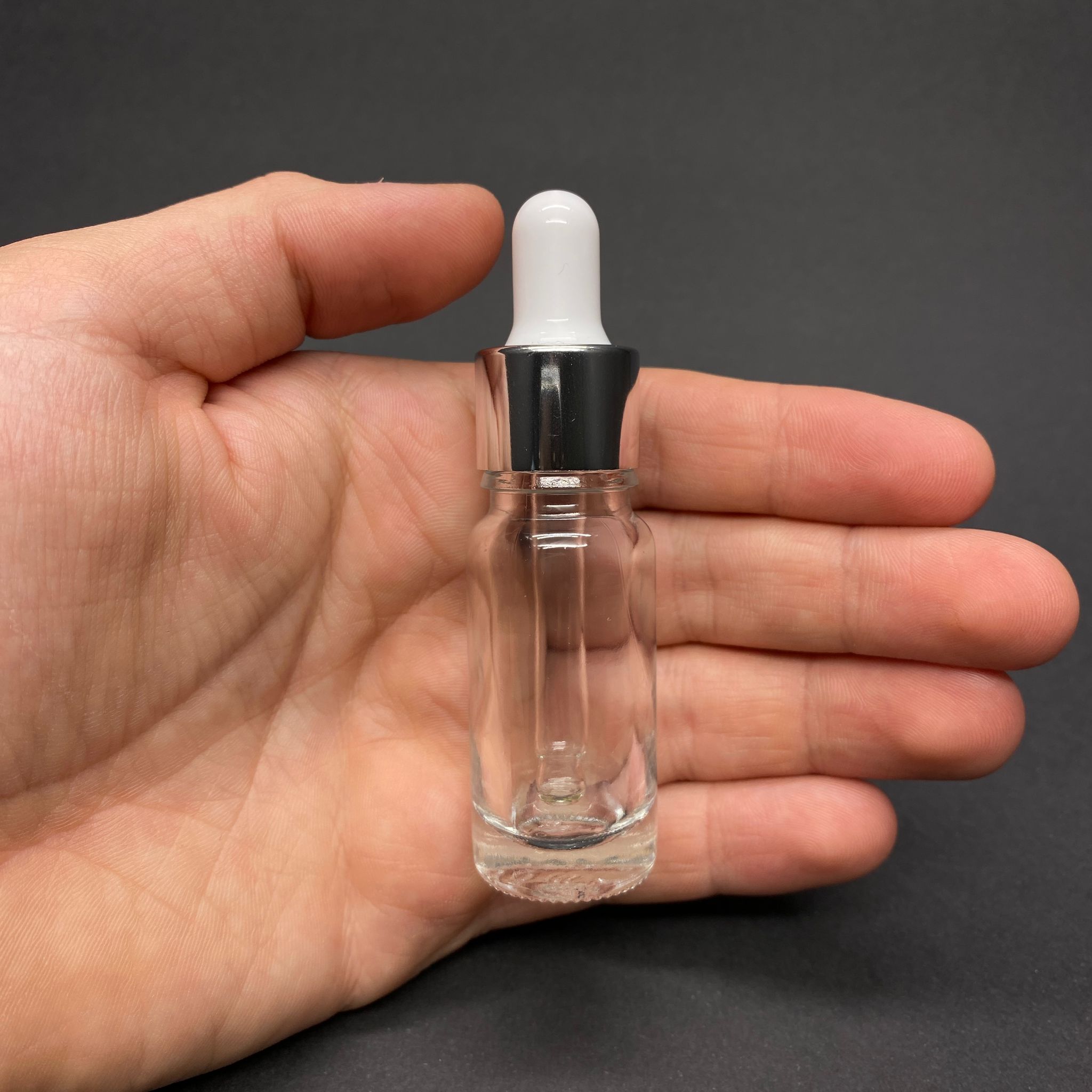 10 CC ŞEFFAF CAM DAMLALIKLI ŞİŞE - BEYAZ EMZİK - GÜMÜŞ METALİK KAPAK - 10 ML SAYDAM CAM DAMLALIKLI ŞİŞE