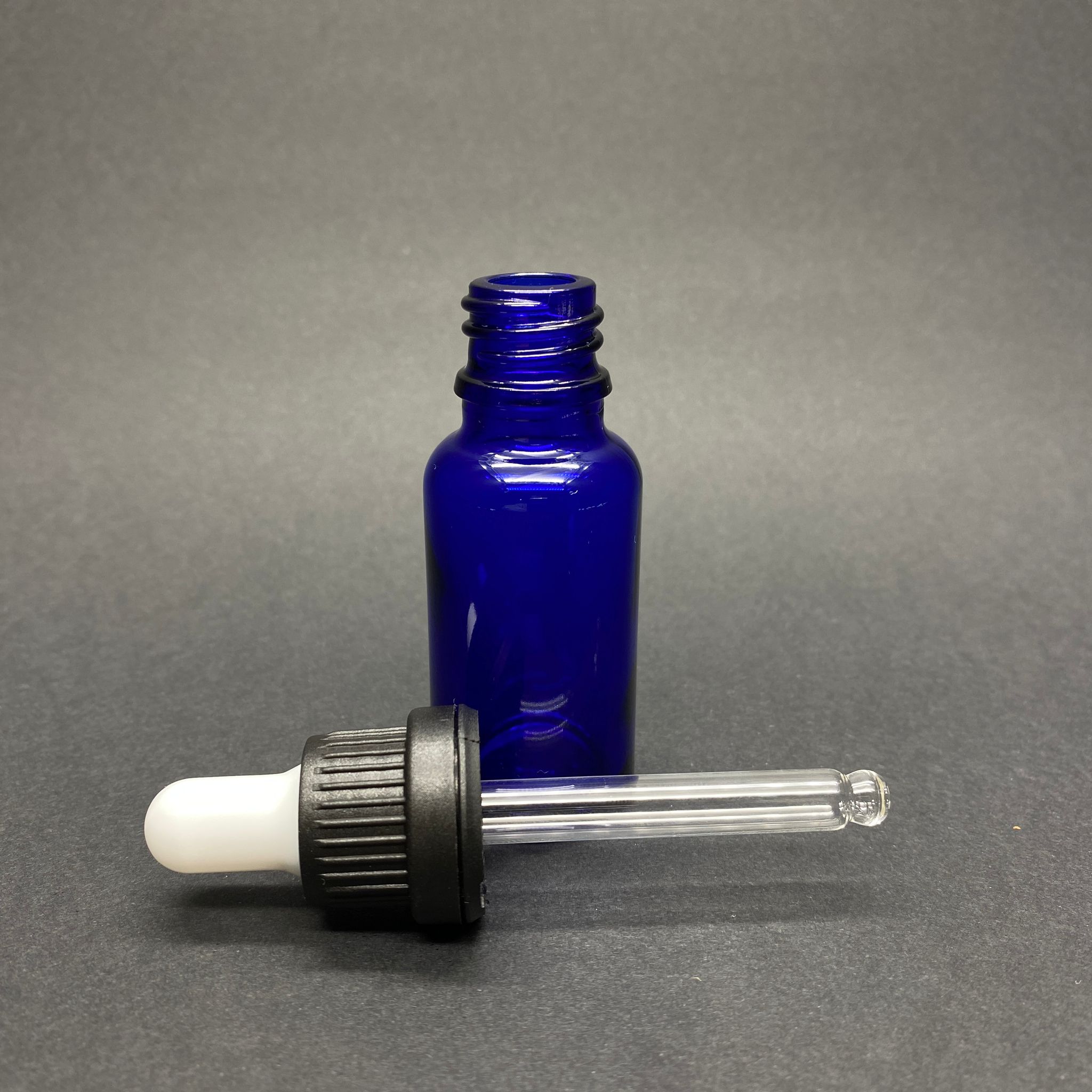 20 CC MAVİ CAM DAMLALIKLI ŞİŞE - BEYAZ EMZİK - SİYAH KİLİTLİ PLASTİK KAPAK - 20 ML MAVİ CAM DAMLALIKLI ŞİŞE
