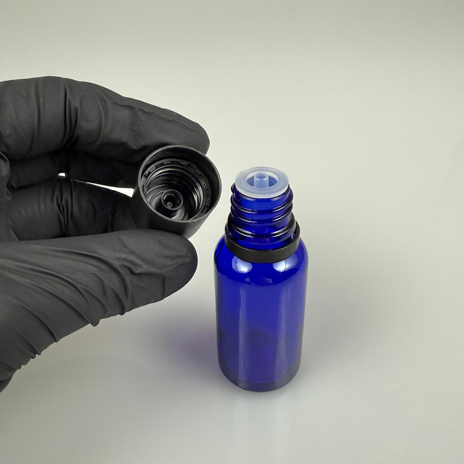 20 CC MAVİ CAM ŞİŞE + İÇTEN DAMLALIKLI ÇOCUK KİLİTLİ SİYAH KAPAK - MAVİ 20 ML KİLİT KAPAKLI DAMLATMALI ŞİŞE