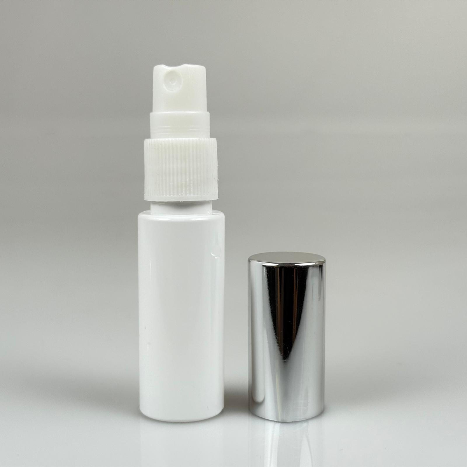 20 ML PET KOLONYA, PARFÜM VB ŞİŞELERİ - METAL ALÜMİNYUM GÜMÜŞ KAPAK + VİDALI SPREY + 20 CC BEYAZ UZUN MODEL ŞİŞE SET TAKIM