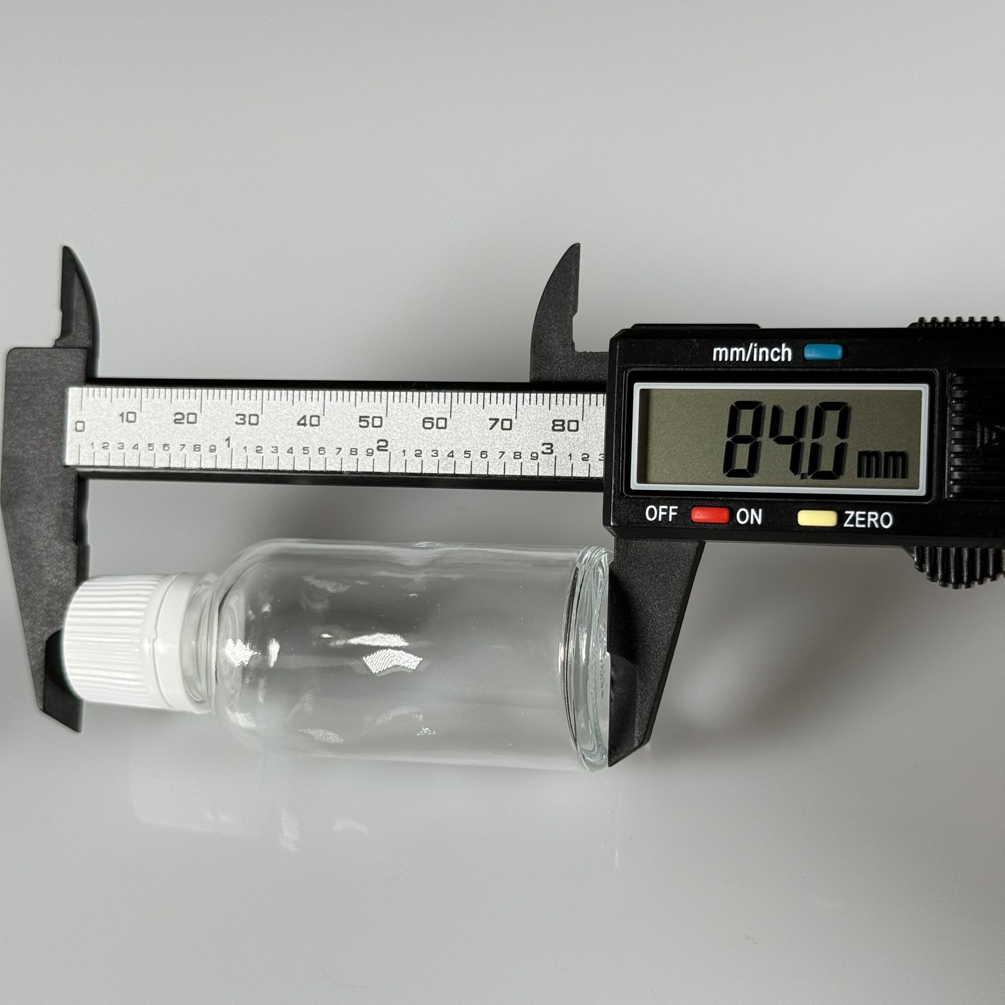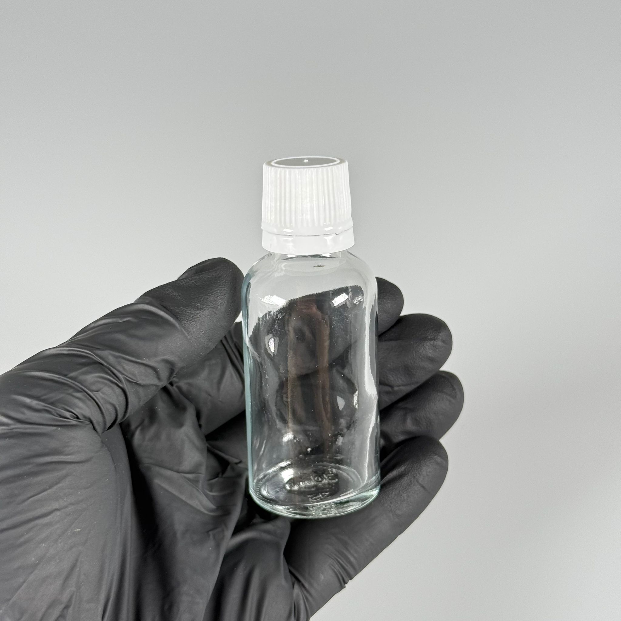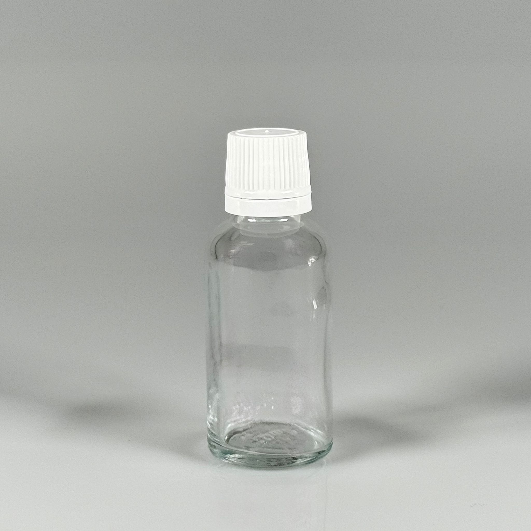 30 CC CAM ŞEFFAF KİLİTLİ, KENDİNDEN CONTALI BEYAZ KAPAKLI - 30 ML DAR AĞIZLI İLAÇ ŞİŞESİ