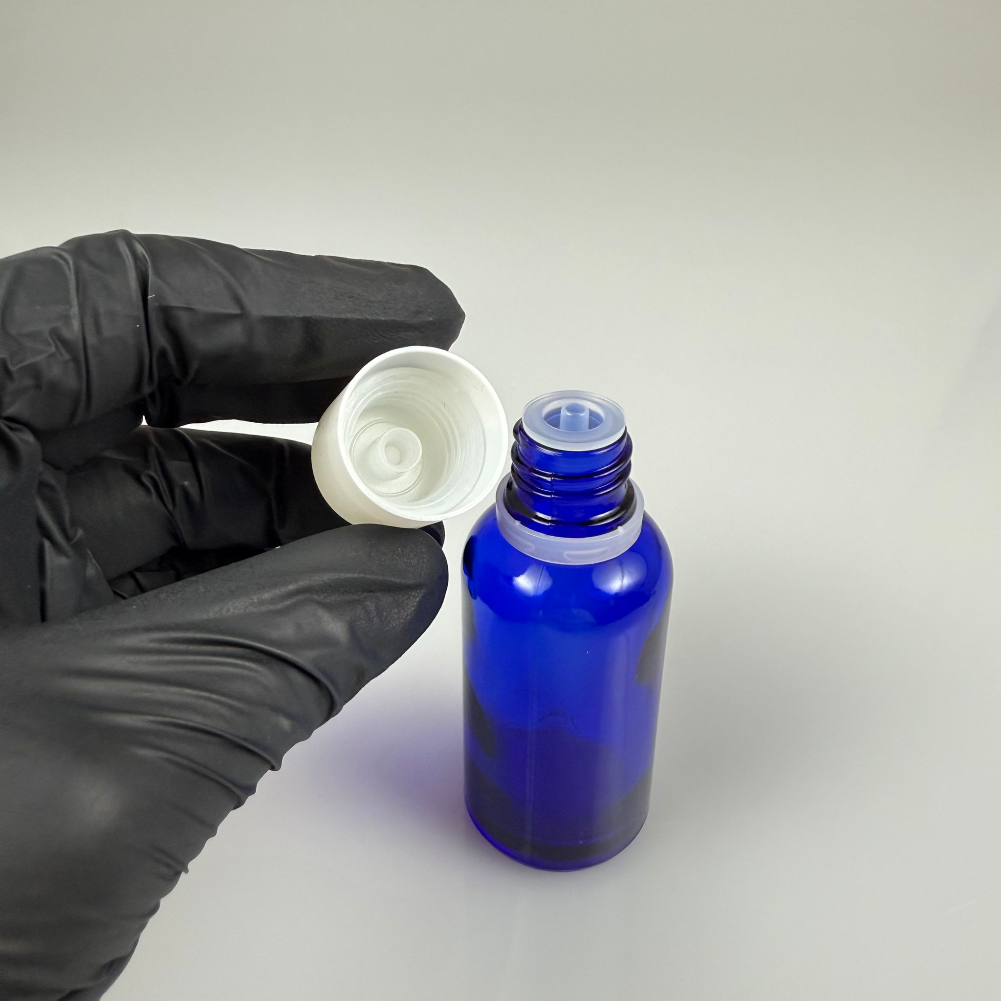 30 CC MAVİ CAM ŞİŞE + İÇTEN DAMLALIKLI ÇOCUK KİLİTLİ BEYAZ KAPAK - MAVİ 30 ML KİLİT KAPAKLI DAMLATMALI ŞİŞE