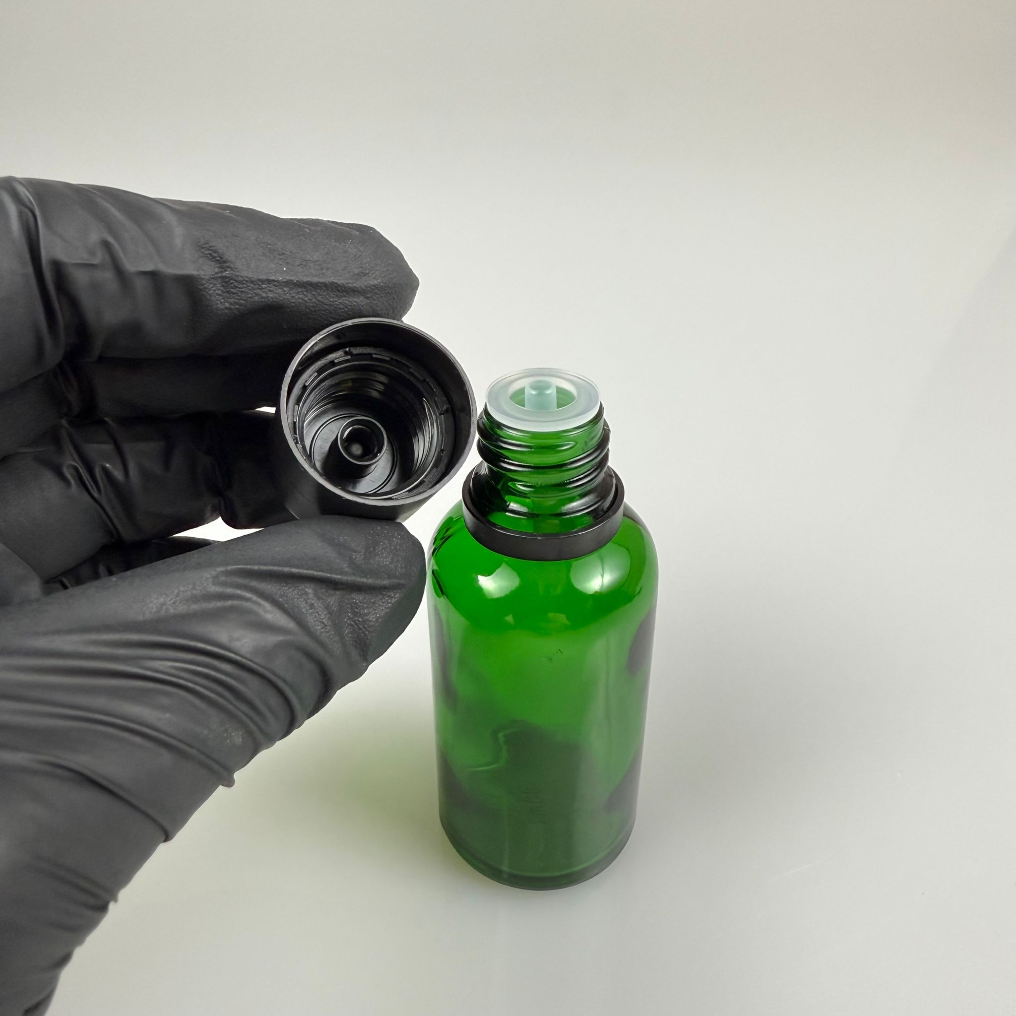 30 CC YEŞİL CAM ŞİŞE + İÇTEN DAMLALIKLI ÇOCUK KİLİTLİ SİYAH KAPAK - YEŞİL 30 ML KİLİT KAPAKLI DAMLATMALI ŞİŞE