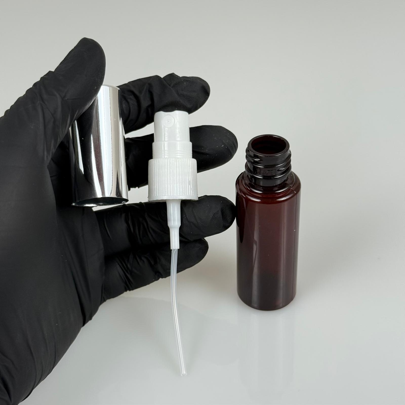 30 ML PET KOLONYA, PARFÜM VB ŞİŞELERİ - METAL ALÜMİNYUM GÜMÜŞ KAPAK + VİDALI SPREY + 30 CC AMBER SHOT ŞİŞE SET TAKIM