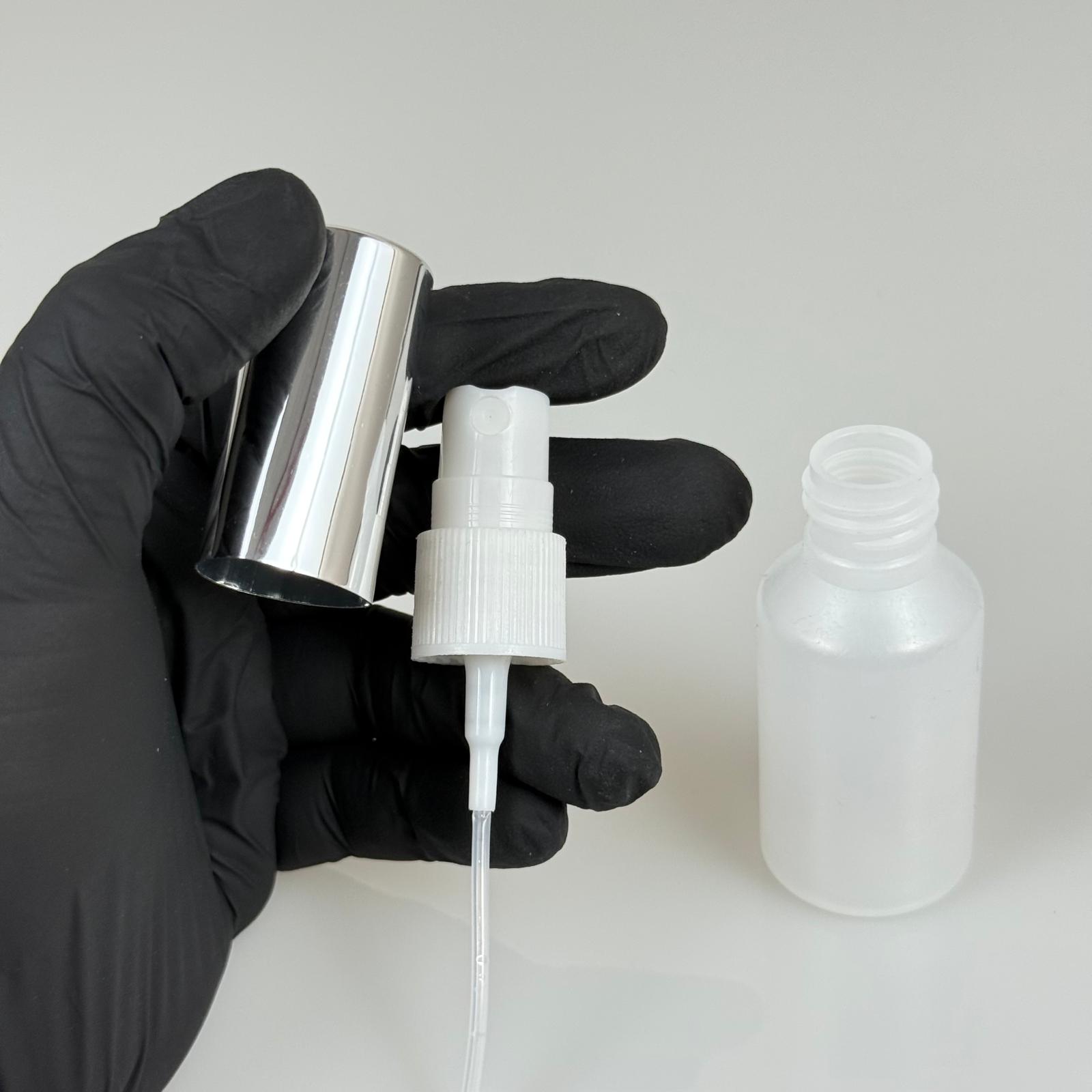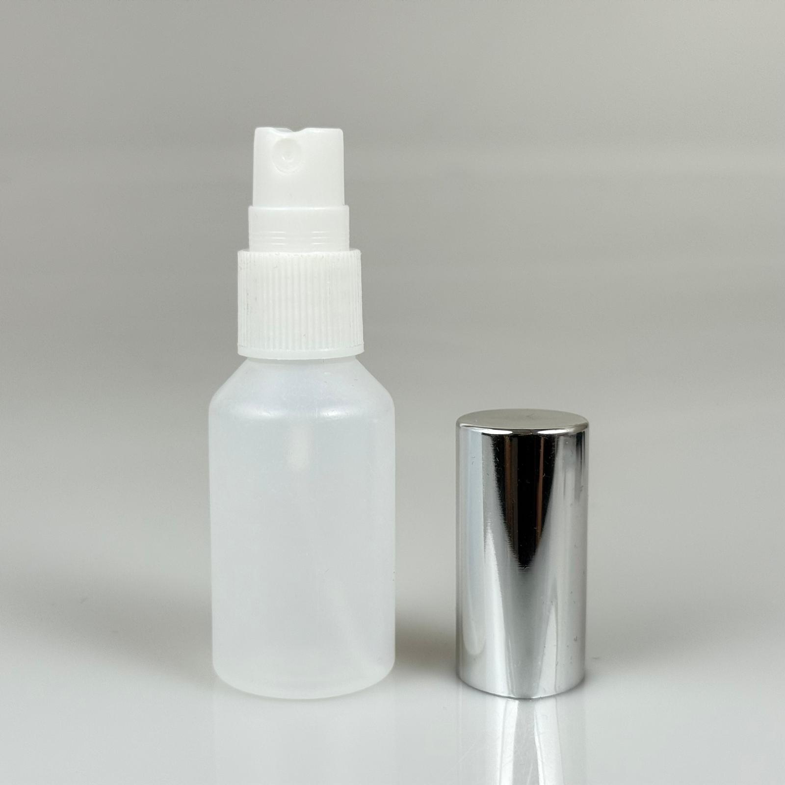 30 ML POLİETİLEN KOLONYA, PARFÜM VB ŞİŞELERİ - METAL ALÜMİNYUM GÜMÜŞ KAPAK + VİDALI SPREY + 30 CC NATÜREL ŞİŞE SET TAKIM