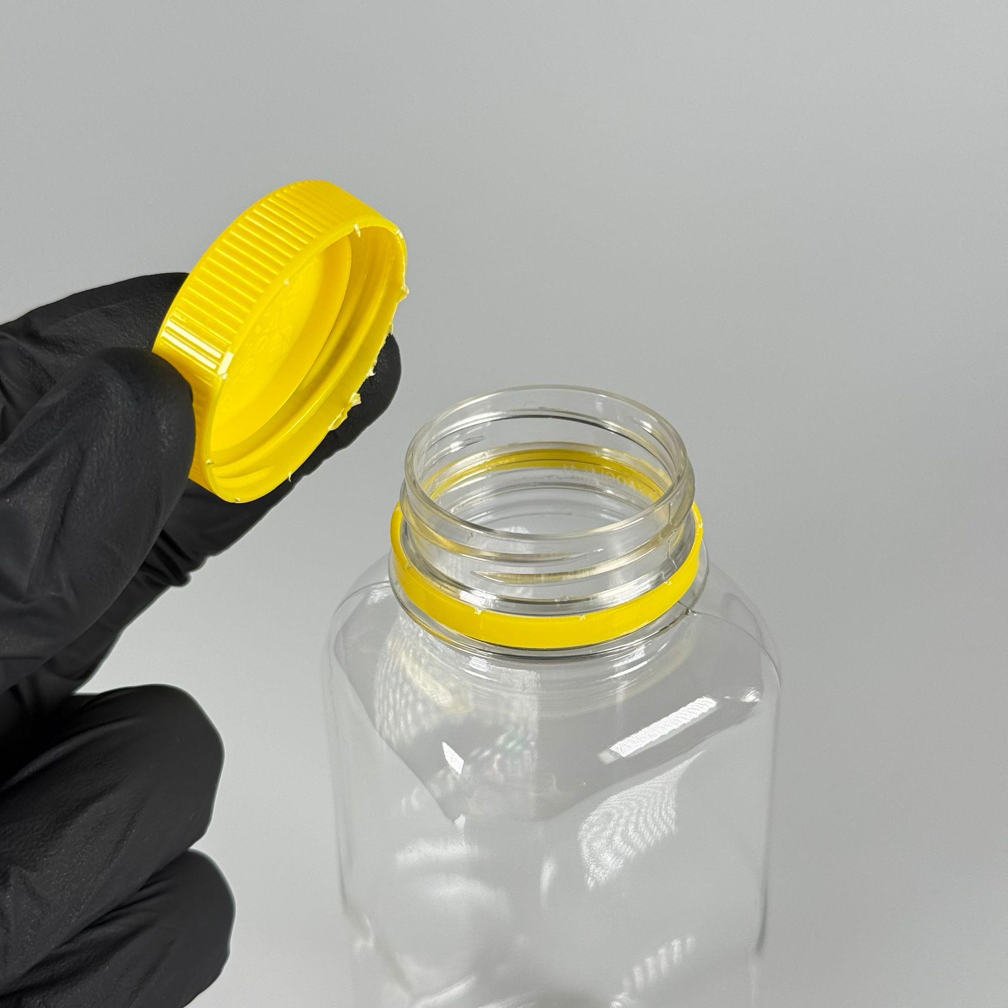 300 CC KÖŞELİ KARE PET ŞİŞE (18,5 GR) - 38 MM GENİŞ AĞIZLI SARI KİLİTLİ KAPAKLI - 300 ML DETOX, MEYVE SUYU, SMOOTHIE, AYRAN, SÜT, MEŞRUBAT VB İÇİN BOŞ PLASTİK ŞİŞELER