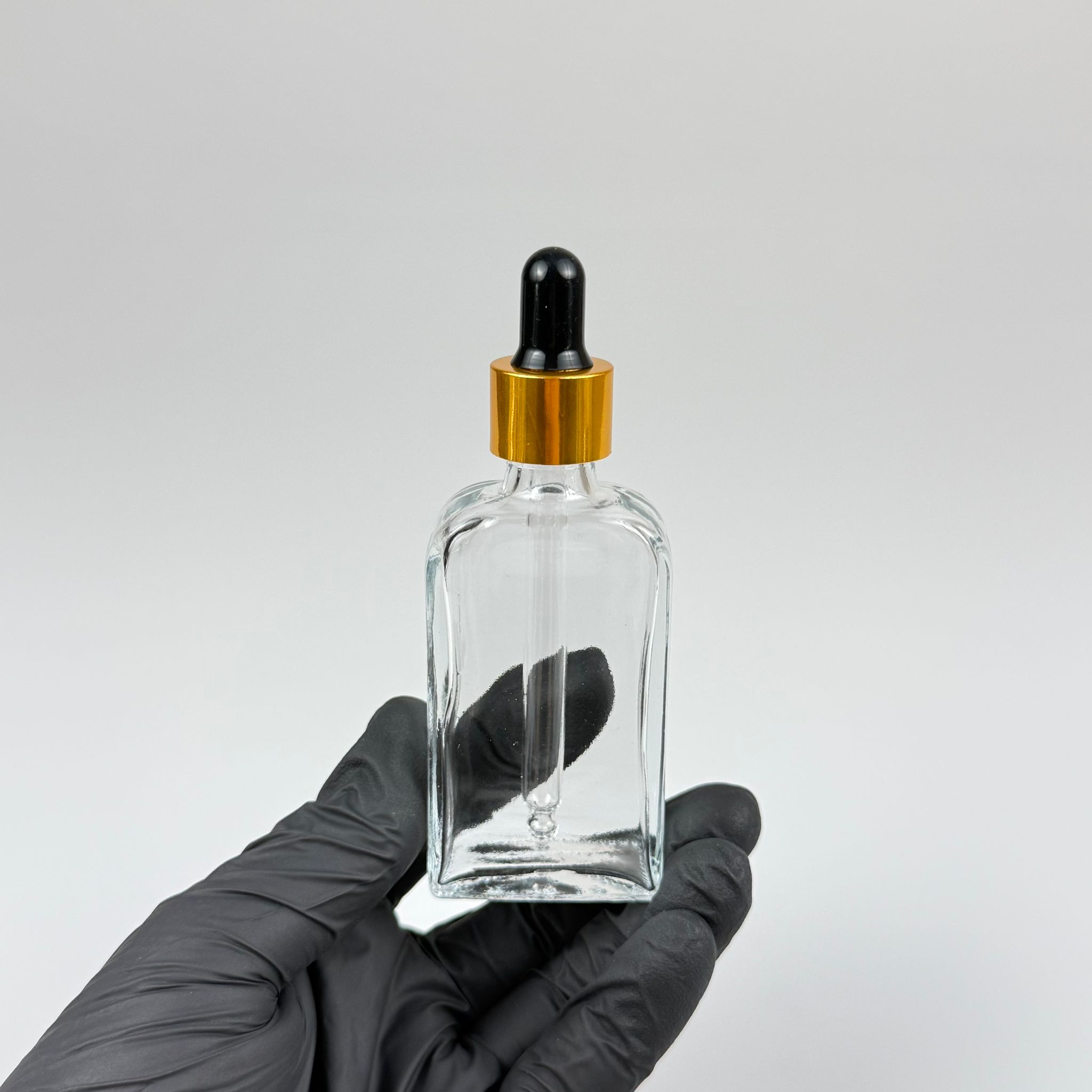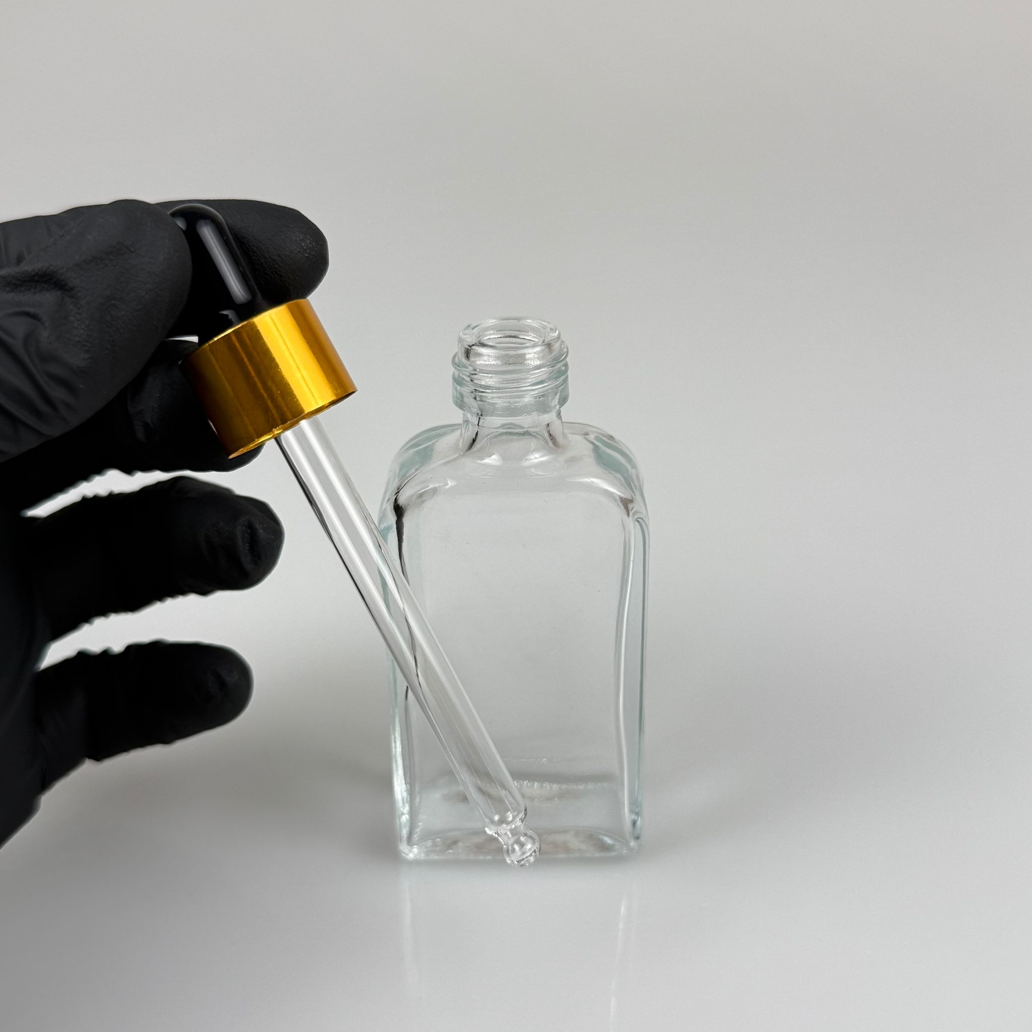 40 CC YASSI DİKDÖRTGEN PRESTİJLİ CAM DAMLALIKLI ŞİŞE - SİYAH EMZİK - GOLD METALİK KAPAK - 40 ML CAM DAMLALIKLI ŞİŞE - DAMLALIKLI BOŞ ŞİŞE