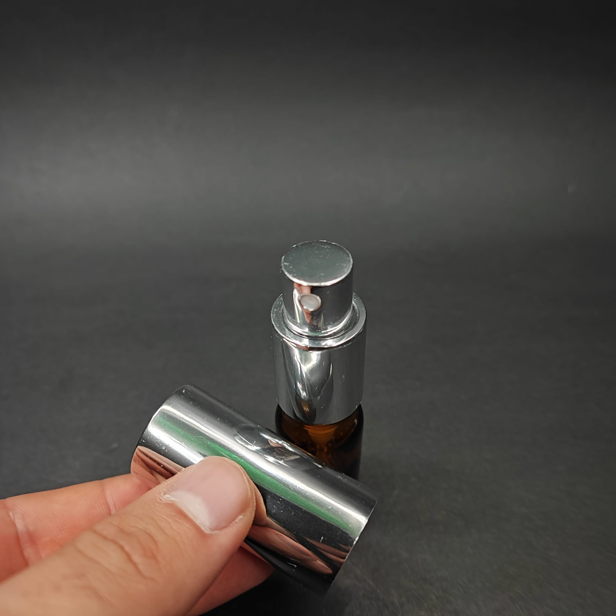 5 ML LÜKS VİDALI VALF ÇEVİRME PARFÜM ŞİŞELERİ - 5 CC AMBER CAM ŞİŞE - GÜMÜŞ METAL SPREYLİ KAPAKLI SET