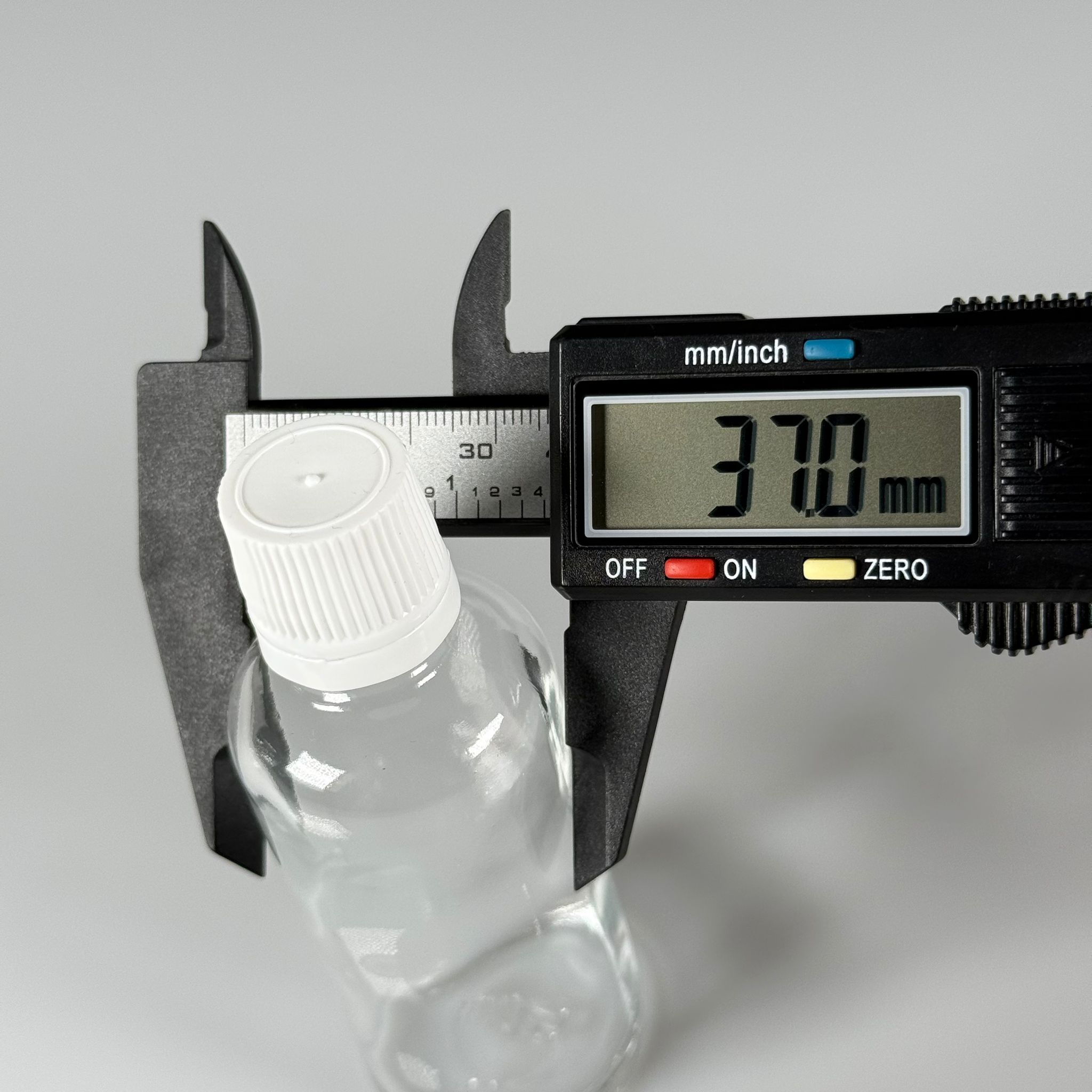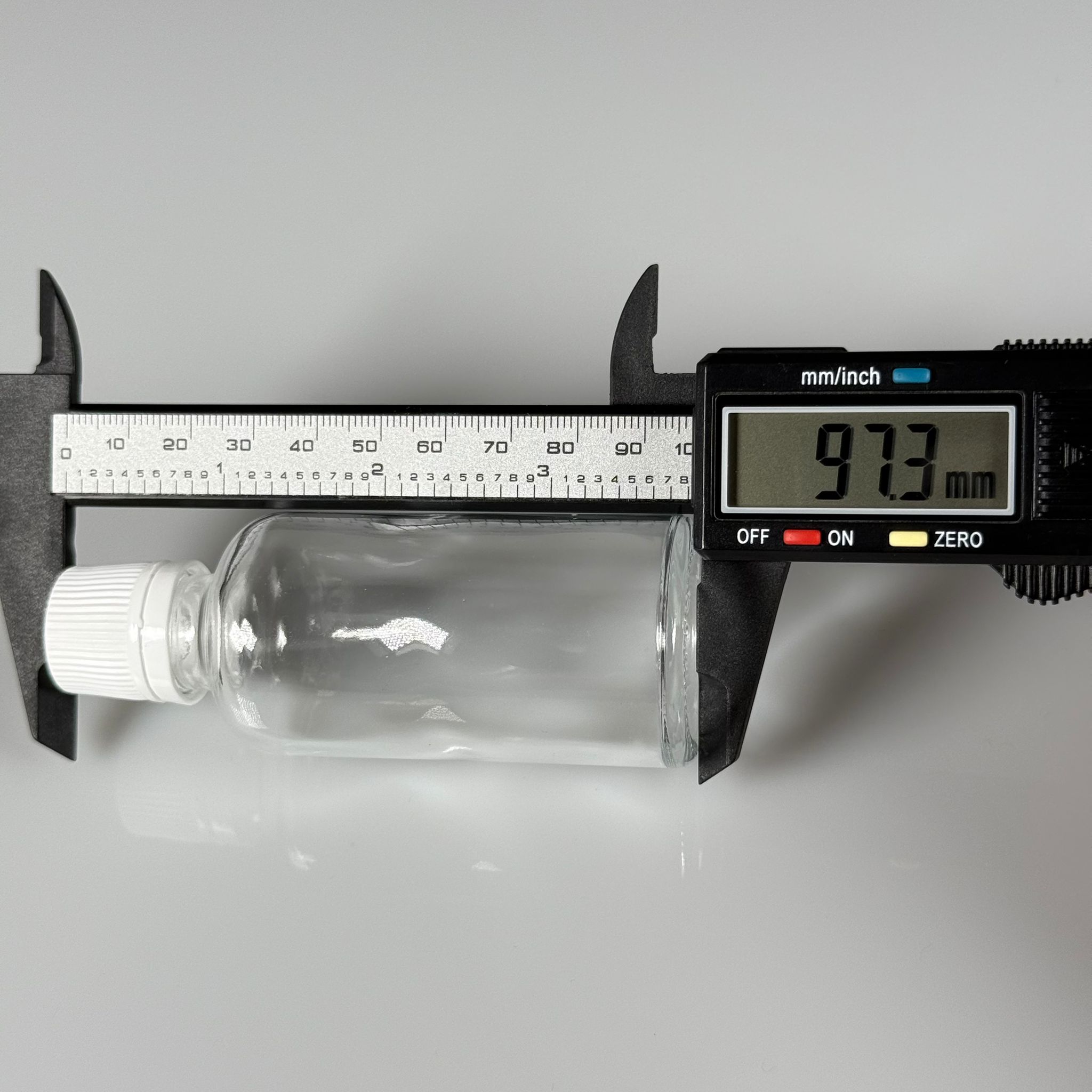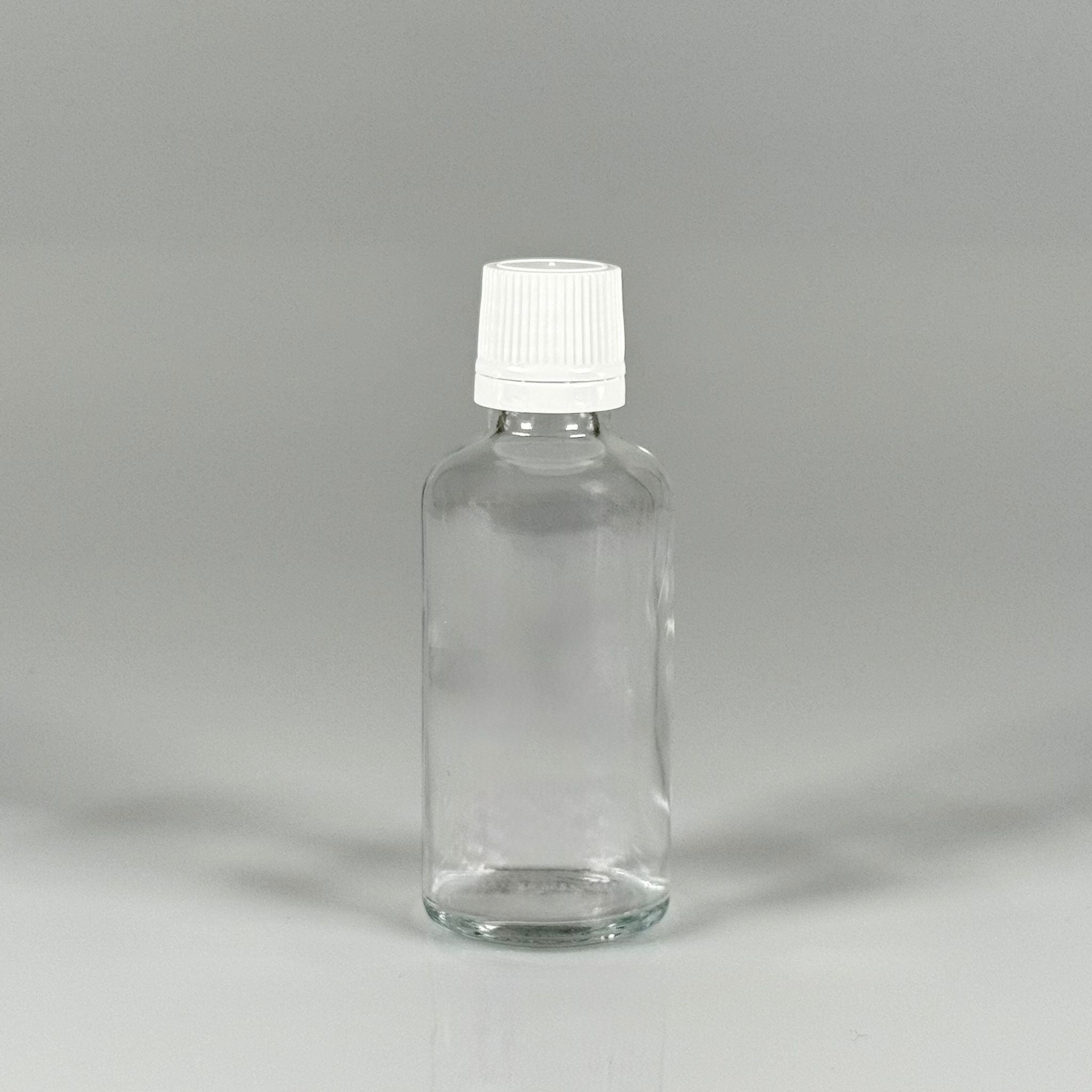 50 CC CAM ŞEFFAF KİLİTLİ, KENDİNDEN CONTALI BEYAZ KAPAKLI - 50 ML DAR AĞIZLI İLAÇ ŞİŞESİ