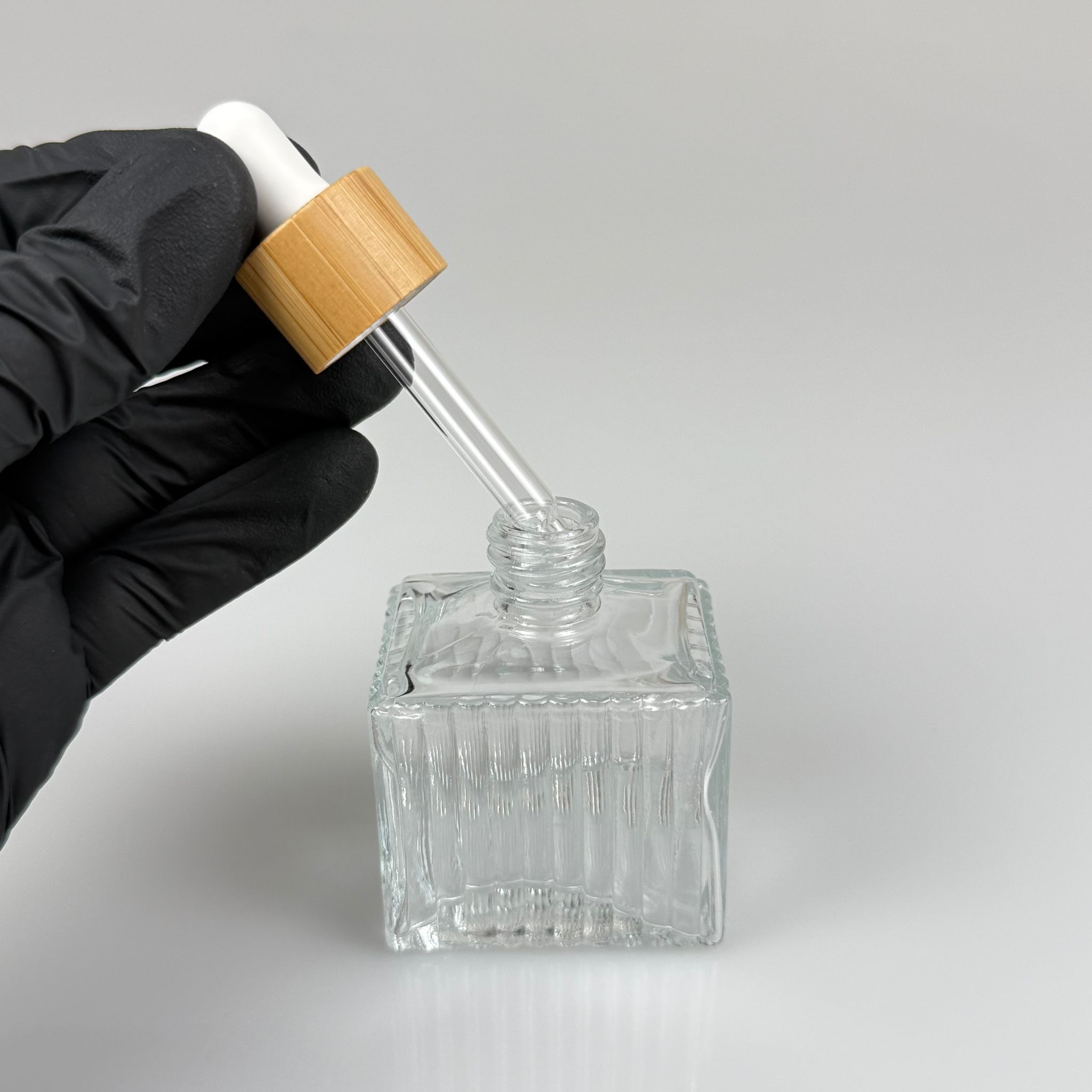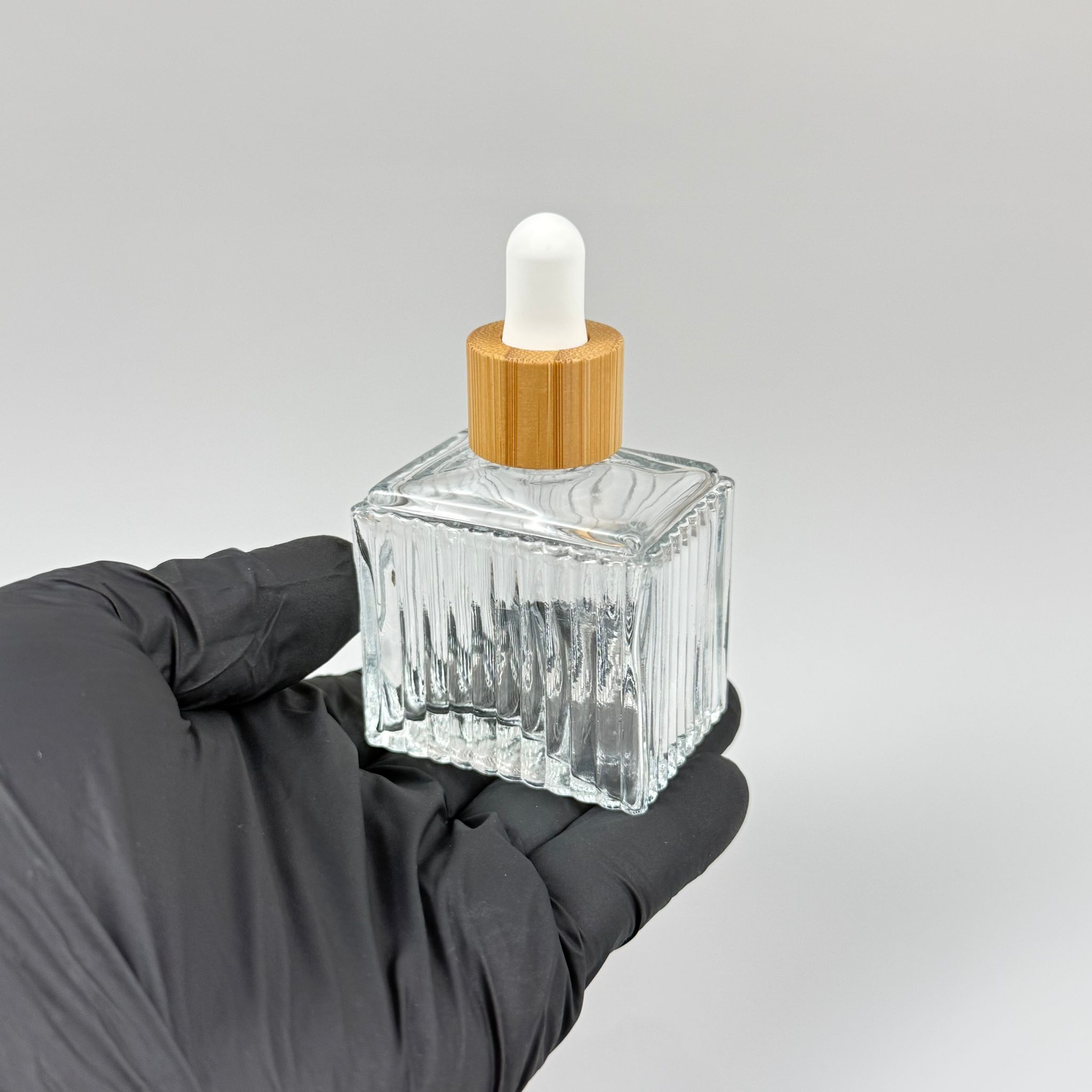 50 CC KÖŞELİ DESENLİ ÇİZGİLİ PRESTİJLİ CAM DAMLALIKLI ŞİŞE - BEYAZ EMZİK - AHŞAP BAMBU KAPAK - 50 ML CAM DAMLALIKLI ŞİŞE - DAMLALIKLI BOŞ ŞİŞE