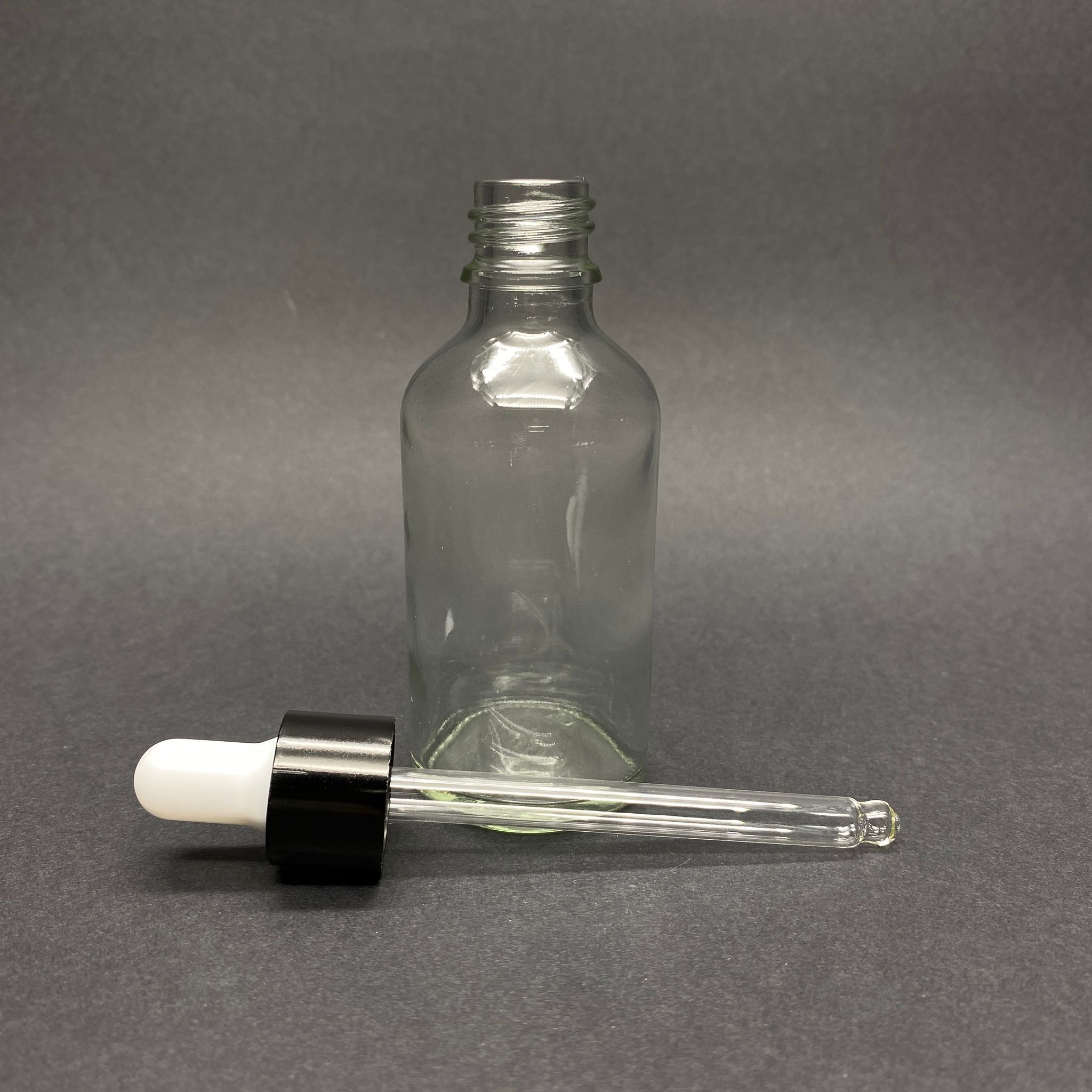 50 CC ŞEFFAF CAM DAMLALIKLI ŞİŞE - BEYAZ EMZİK - SİYAH METALİK KAPAK - 50 ML SAYDAM CAM DAMLALIKLI ŞİŞE