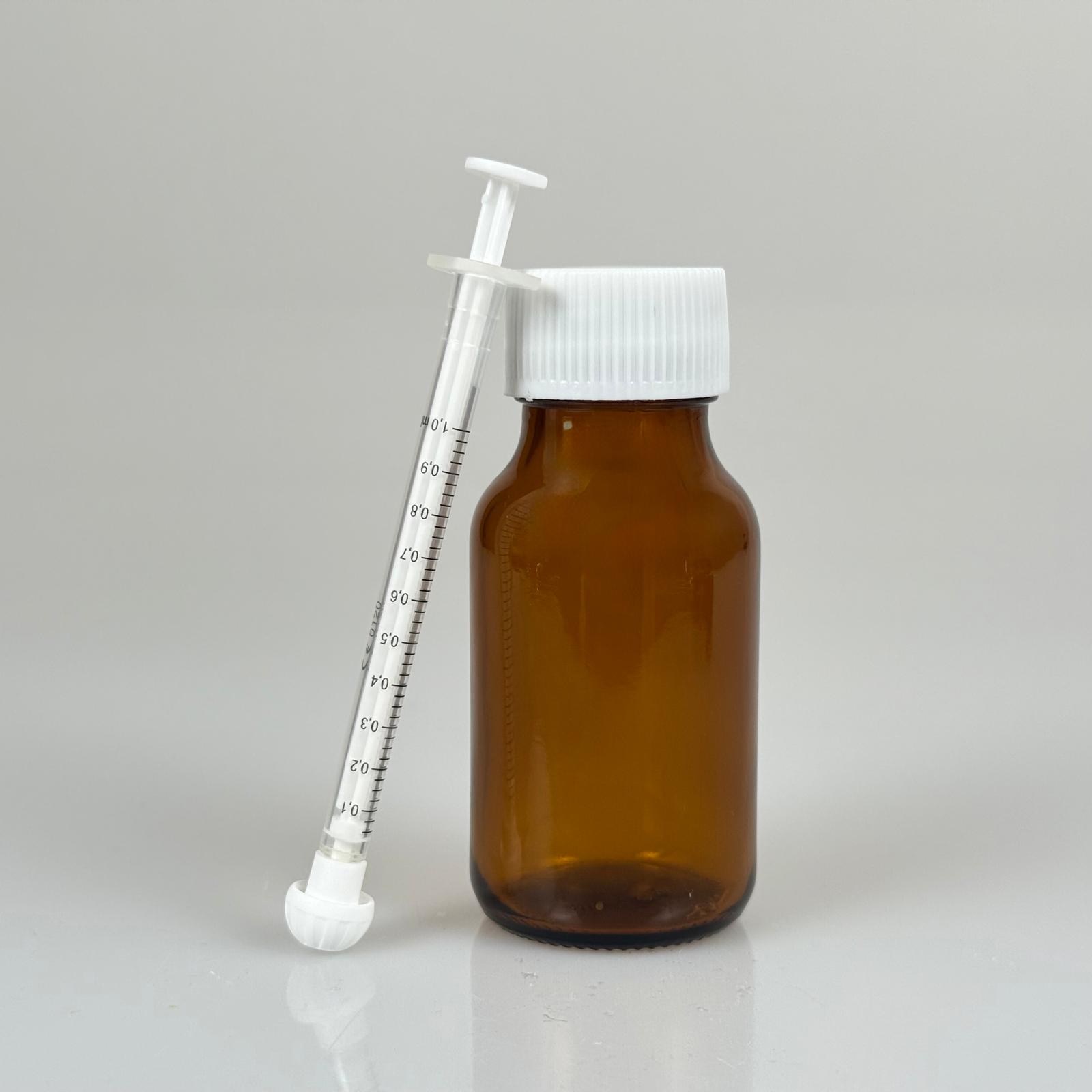 50 ML CAM ECZA ŞİŞESİ + 1 ML DOZAJ PİPETİ + DOZAJ TIPASI + CONTALI PLASTİK KAPAK TAKIM