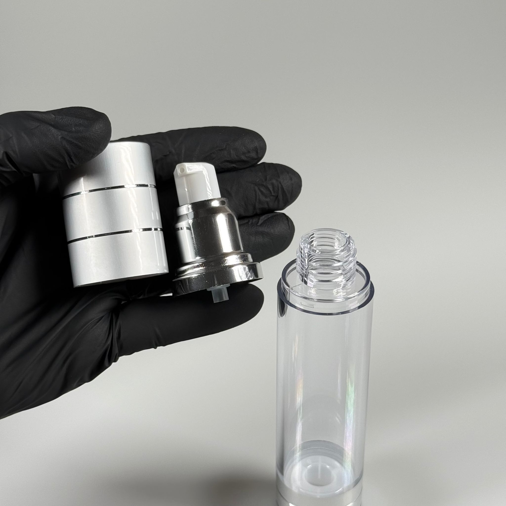 BOŞ KREM VE LOSYON ŞİŞESİ 50 ML BOŞ AİRLESS ŞİŞE - HAVASIZ POMPALI GÜMÜŞ ÜSTÜ YALDIZLI AİRLESS ŞİŞE