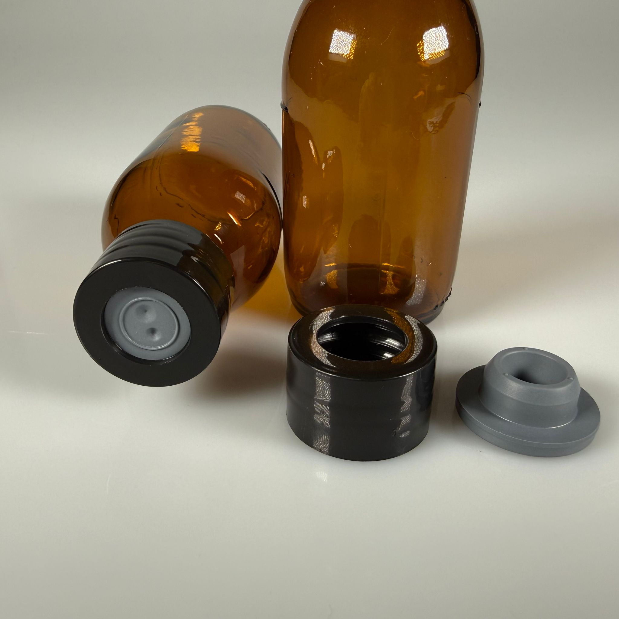FLAKON ENJEKTÖR SERUM ŞİŞESİ - 100 ML AMBER ECZA CAM ŞİŞE + VİDALI DELİKLİ KAPAK (ELLE ÇEVİREREK KAPANIR) + KAUÇUK BUTİL TIPA TAKIM