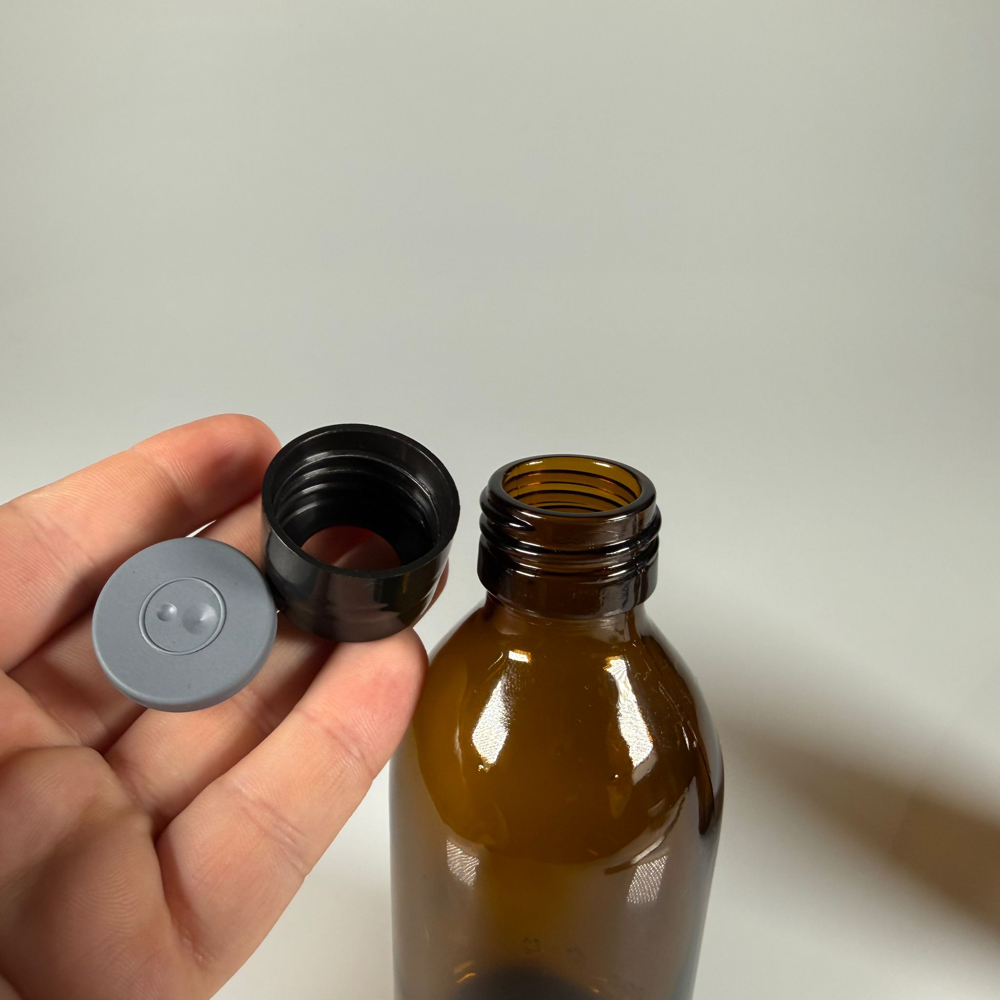FLAKON ENJEKTÖR SERUM ŞİŞESİ - 200 ML ECZA CAM ŞİŞE + VİDALI DELİKLİ KAPAK (ELLE ÇEVİREREK KAPANIR) + KAUÇUK BUTİL TIPA TAKIM