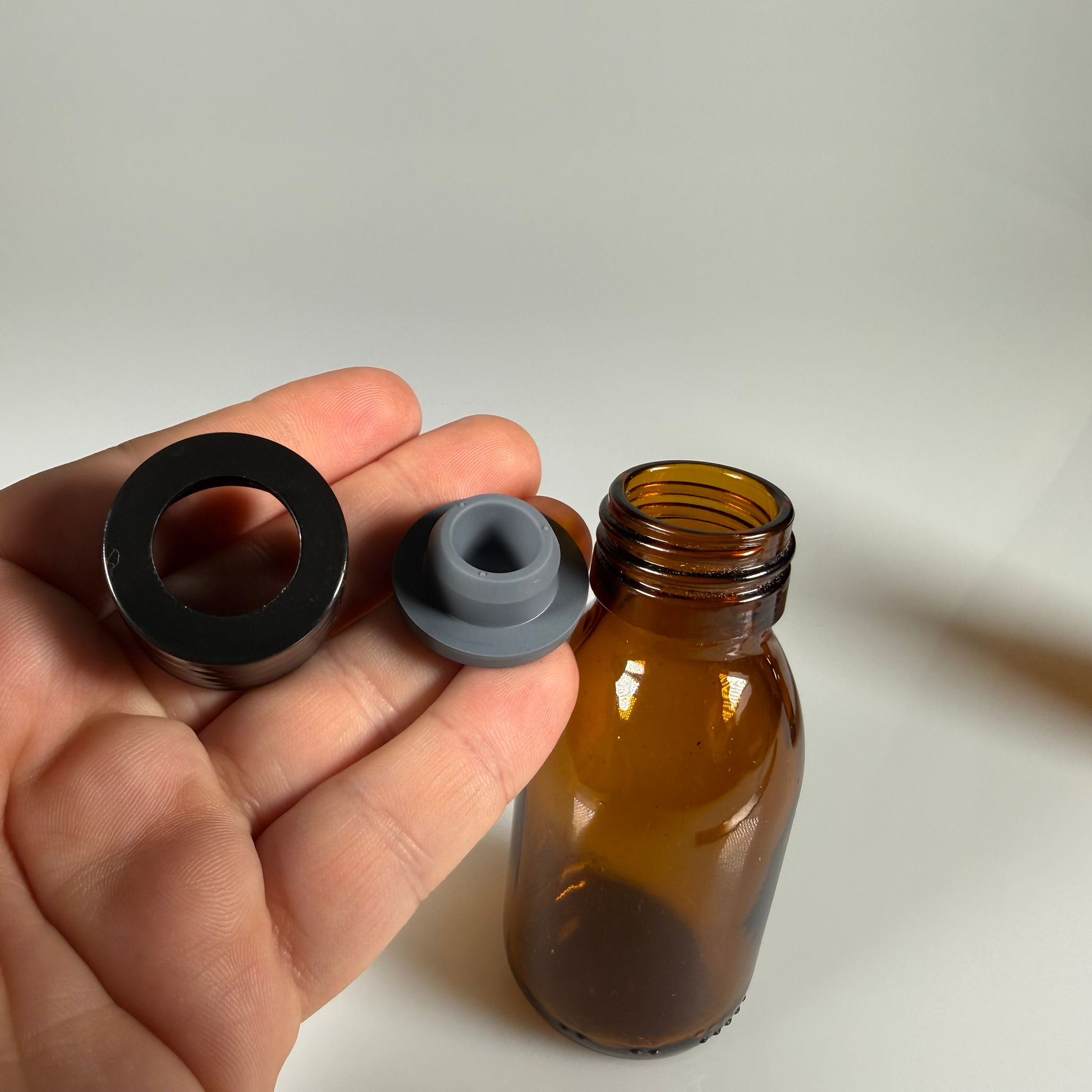FLAKON ENJEKTÖR SERUM ŞİŞESİ - 75 ML AMBER ECZA CAM ŞİŞE + VİDALI DELİKLİ KAPAK (ELLE ÇEVİREREK KAPANIR) + KAUÇUK BUTİL TIPA TAKIM