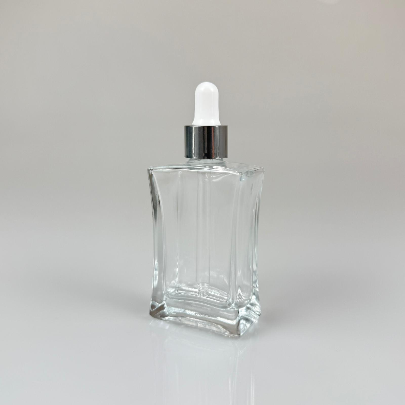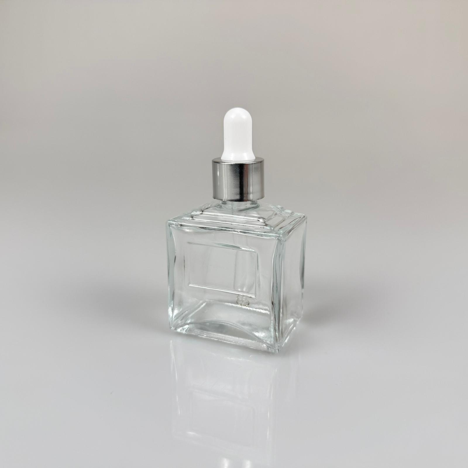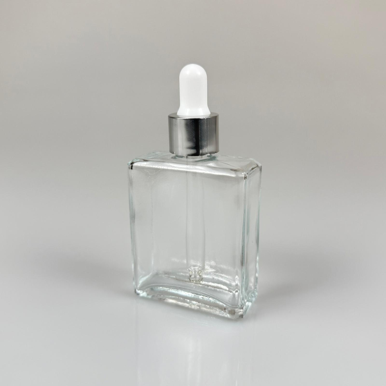 50 CC YASSI DİKDÖRTGEN KÖŞELİ CAM DAMLALIKLI ŞİŞE - BEYAZ EMZİK - GÜMÜŞ METALİK KAPAK - 50 ML CAM DAMLALIKLI ŞİŞE - DAMLALIKLI BOŞ ŞİŞE