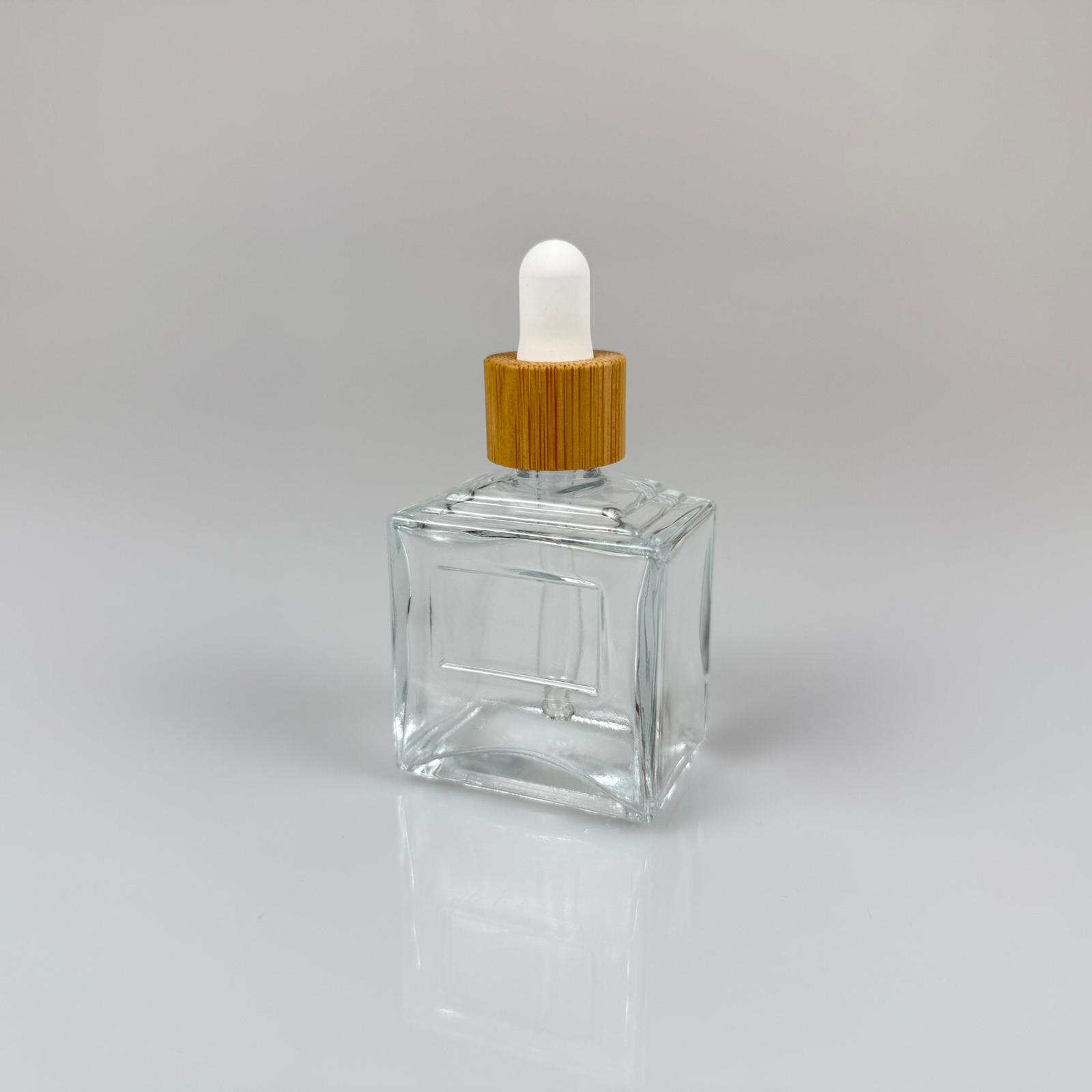 40 CC YASSI DİKDÖRTGEN KÖŞELİ KISA PRESTİJLİ CAM DAMLALIKLI ŞİŞE - BEYAZ EMZİK - AHŞAP BAMBU KAPAK - 40 ML CAM DAMLALIKLI ŞİŞE - DAMLALIKLI BOŞ ŞİŞE