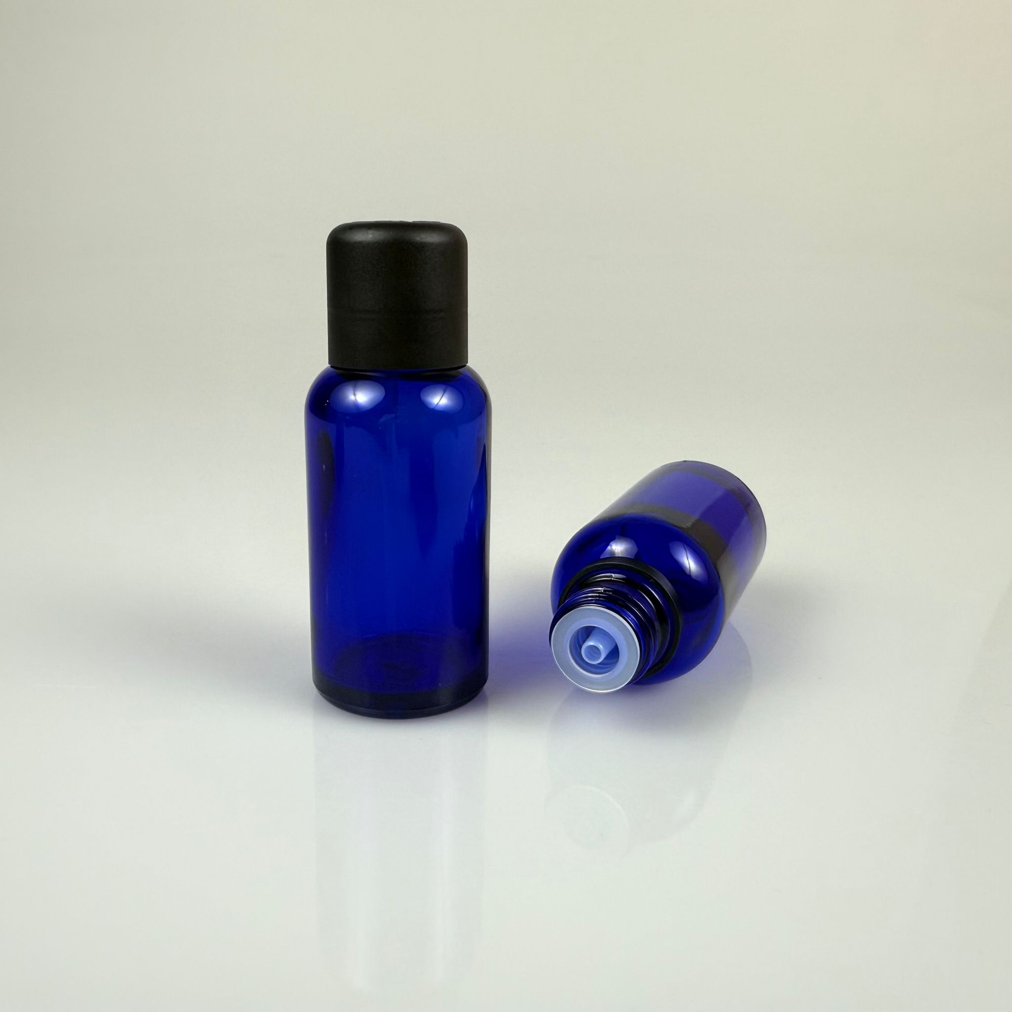 30 CC MAVİ CAM ŞİŞE + İÇTEN DAMLALIKLI ÇOCUK KİLİTLİ SİYAH KAPAK - MAVİ 30 ML KİLİT KAPAKLI DAMLATMALI ŞİŞE