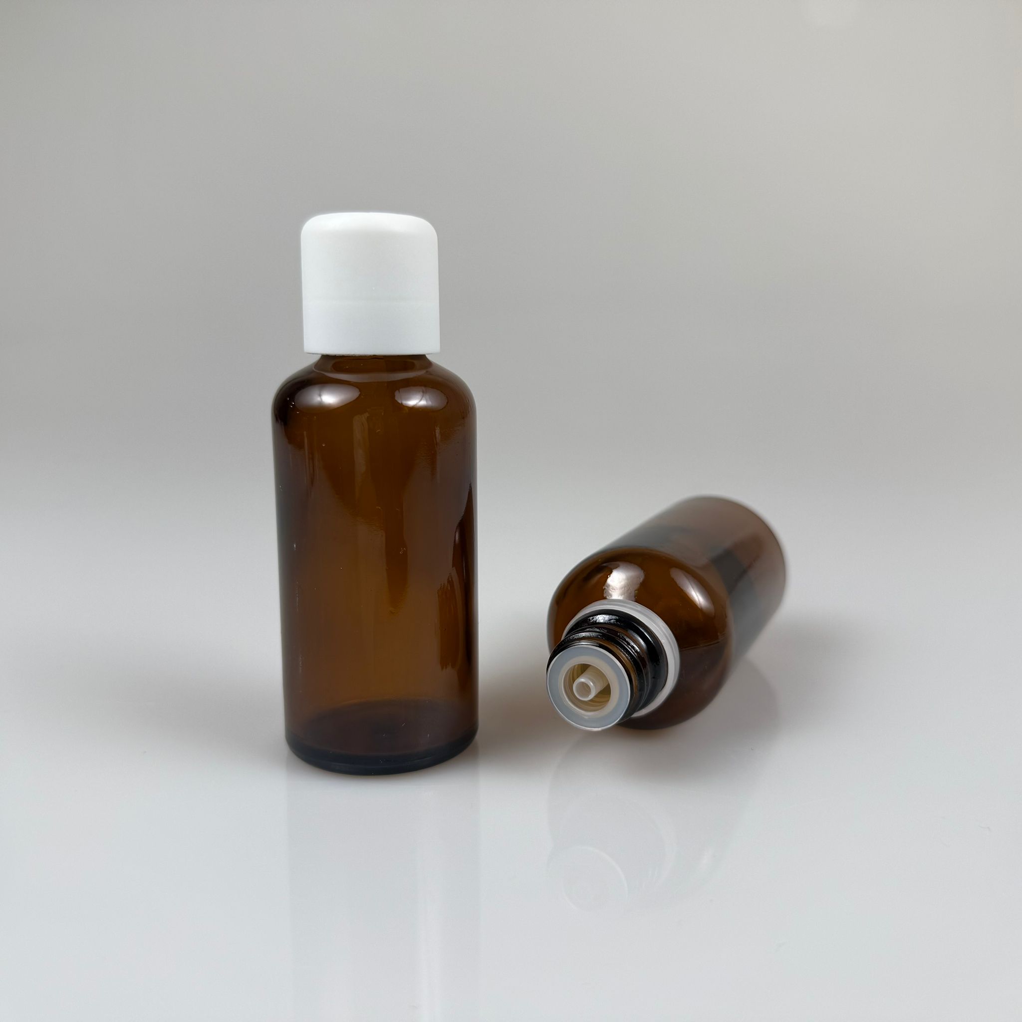 50 CC AMBER CAM ŞİŞE + İÇTEN DAMLALIKLI ÇOCUK KİLİTLİ BEYAZ KAPAK - KAHVERENGİ 50 ML KİLİT KAPAKLI DAMLATMALI ŞİŞE
