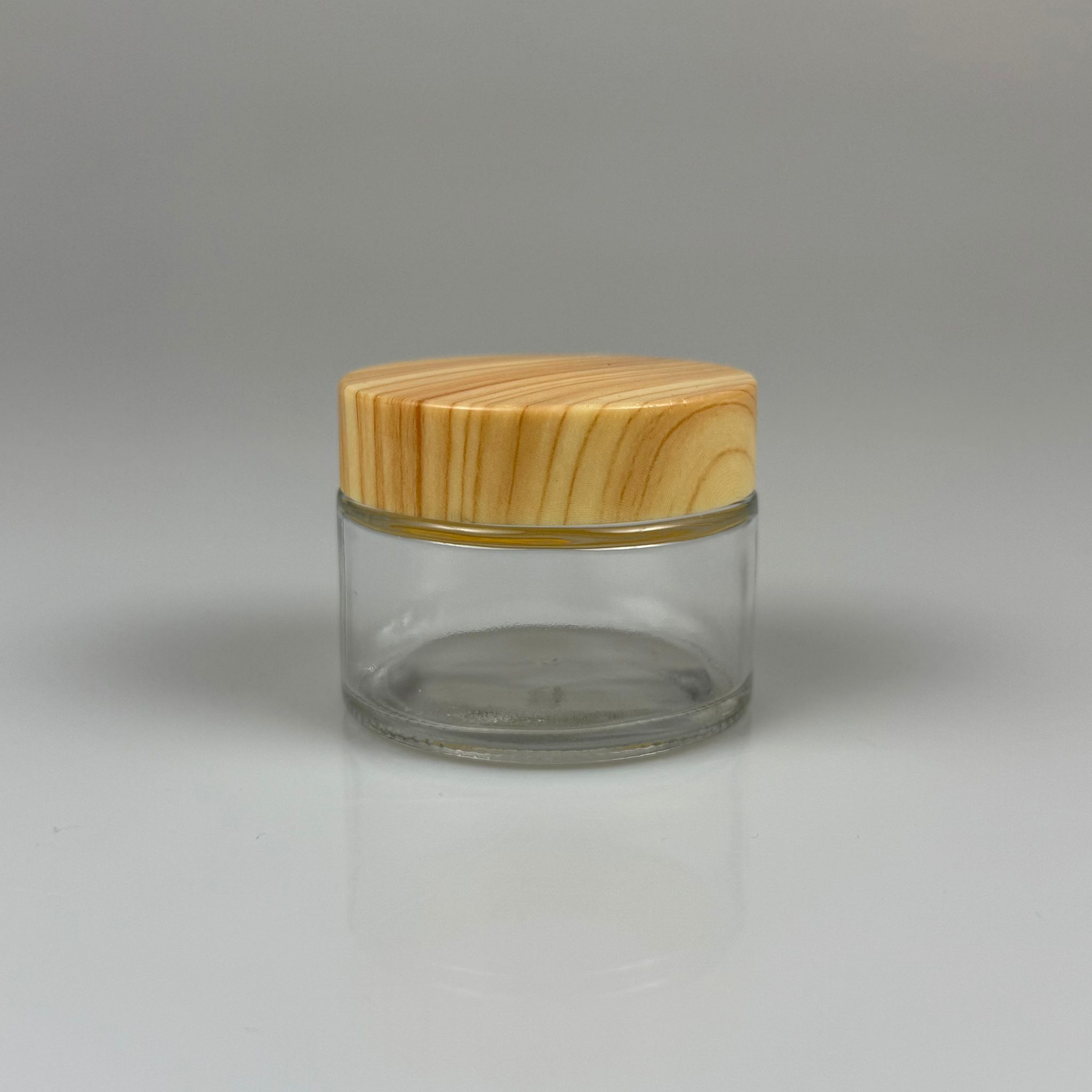 50 CC CAM ŞEFFAF KREM KAVANOZU - AHŞAP DESENLİ PLASTİK KAPAKLI İÇ CONTALI - 50 ML CAM KAVANOZ - KOZMETİK KAVANOZ