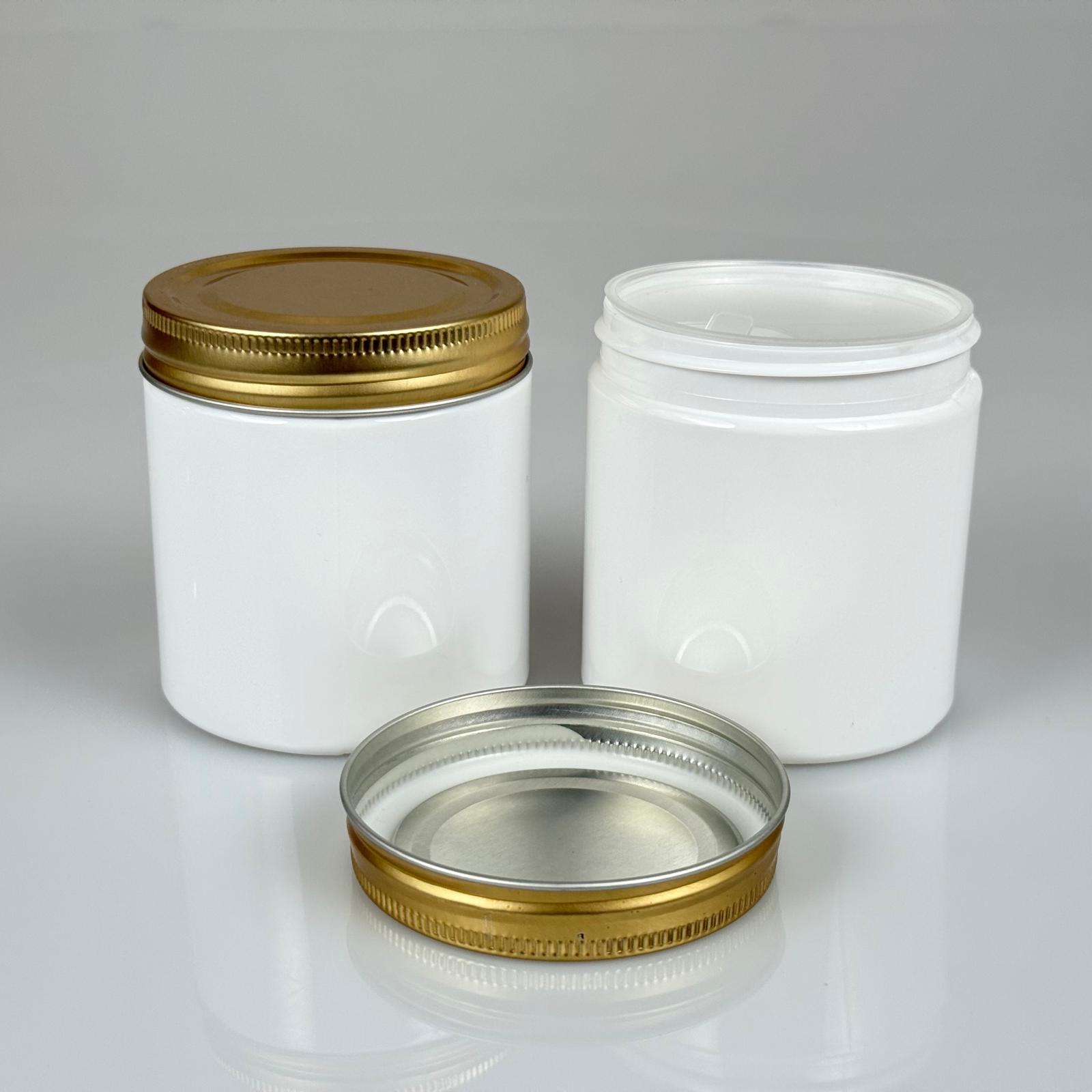 250 CC BEYAZ SERT PLASTİK KAVANOZ - GOLD METAL KAPAKLI - 250 ML METAL KAPAKLI PLASTİK KAVANOZ - KOZMETİK KAVANOZ, GIDA KAVANOZU VE KREM KAVANOZU OLARAK KULLANABİLİRSİNİZ