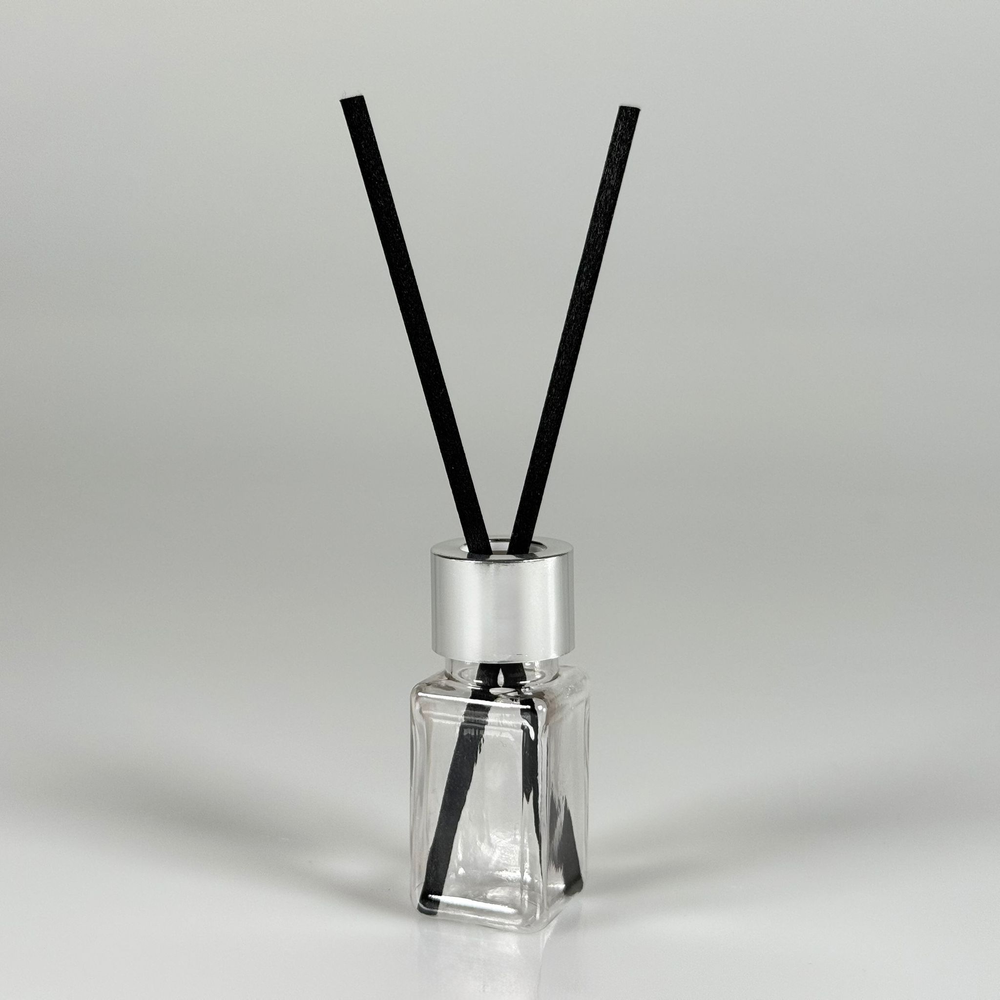 PLASTİK PET DİFÜZÖR ODA KOKUSU BAMBU ŞİŞESİ - 10 ML KARE - ŞİŞE + GÜMÜŞ METAL KAPAK + TIPA + 24 CM FİBER ÇUBUK